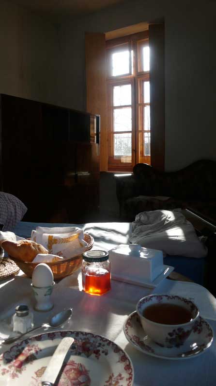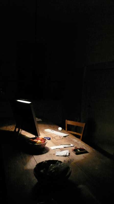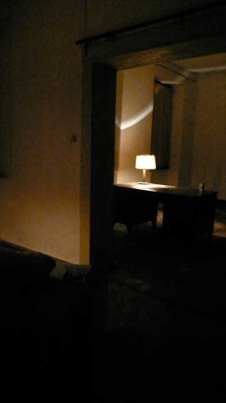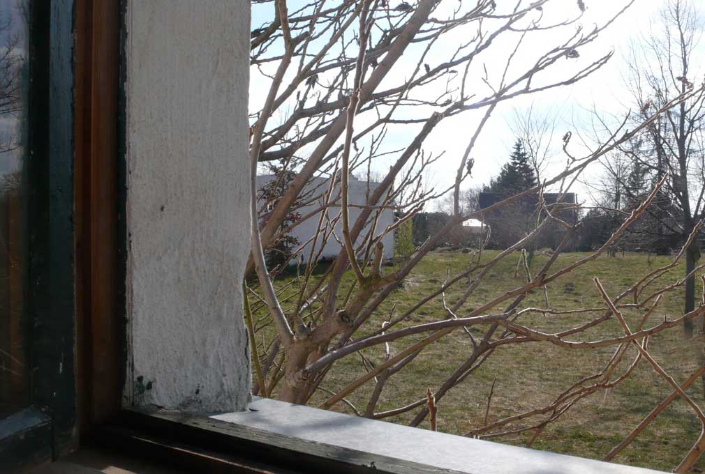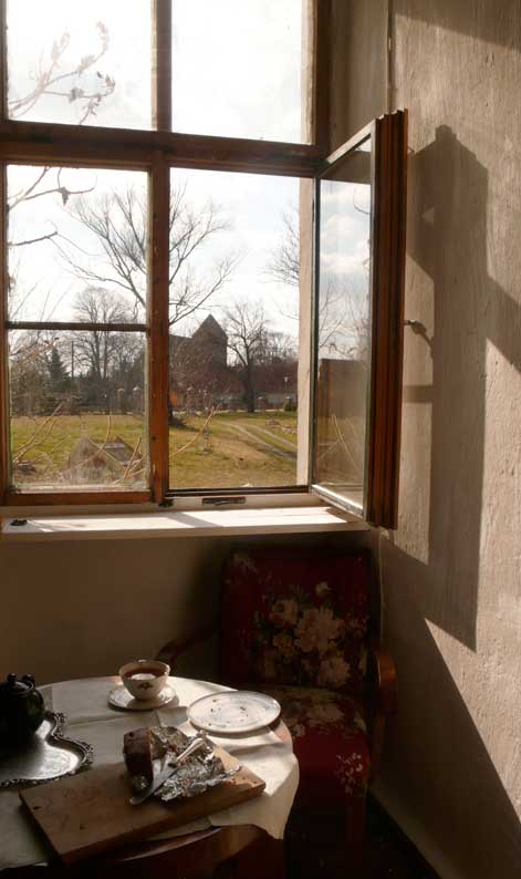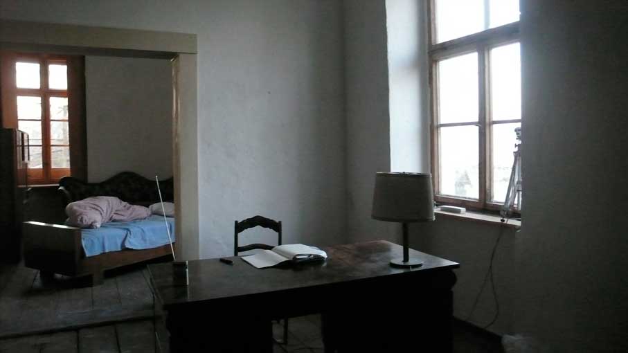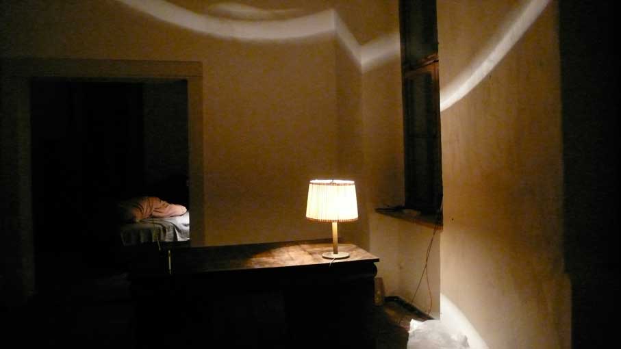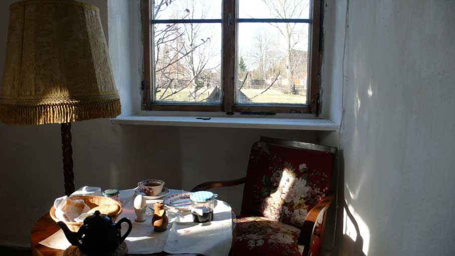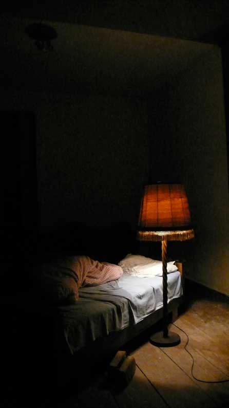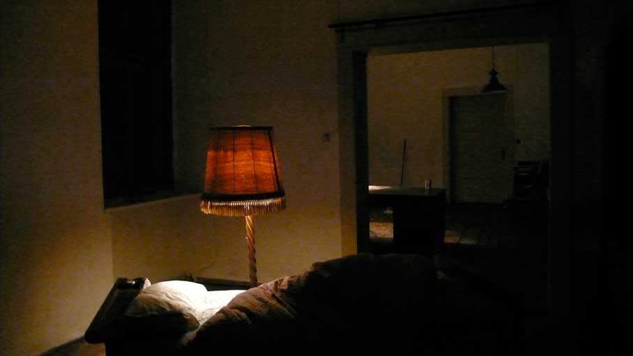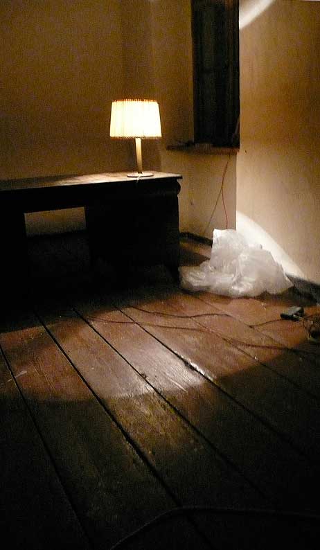 Alle Räume leer, Wände, decken frisch gestrichen, langsames Behaupten der lebenswichtigen Gegenstände wie Inszenierungem nochmal alles neu. Tisch, Stuhl, Bett, Lampe. Durch den Tag.