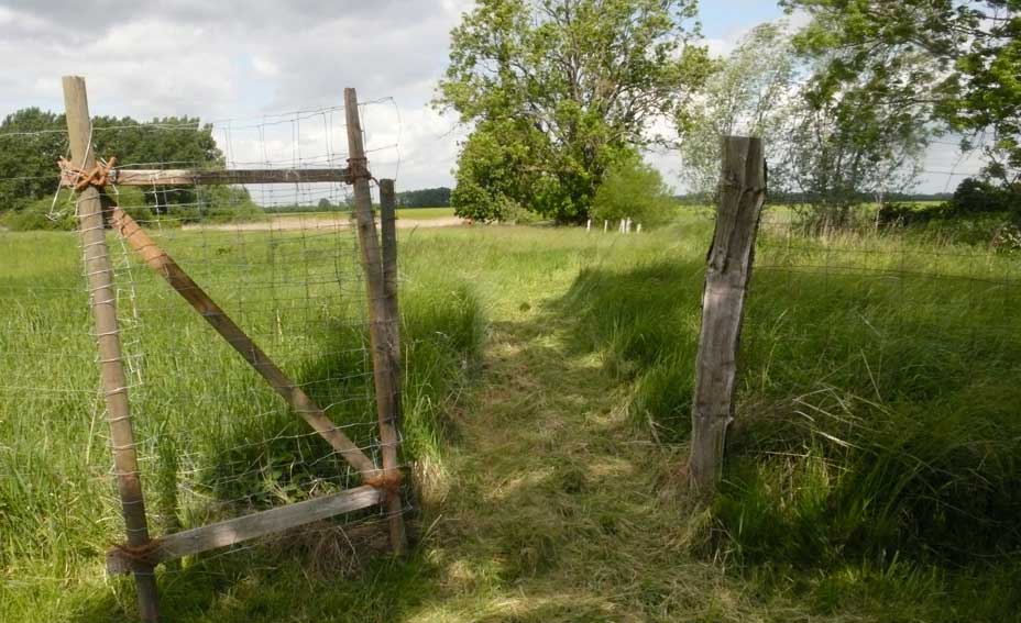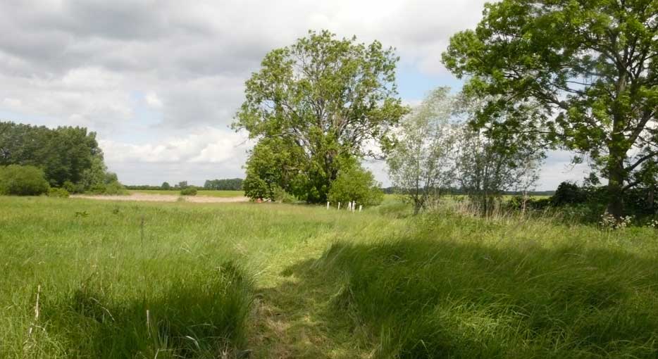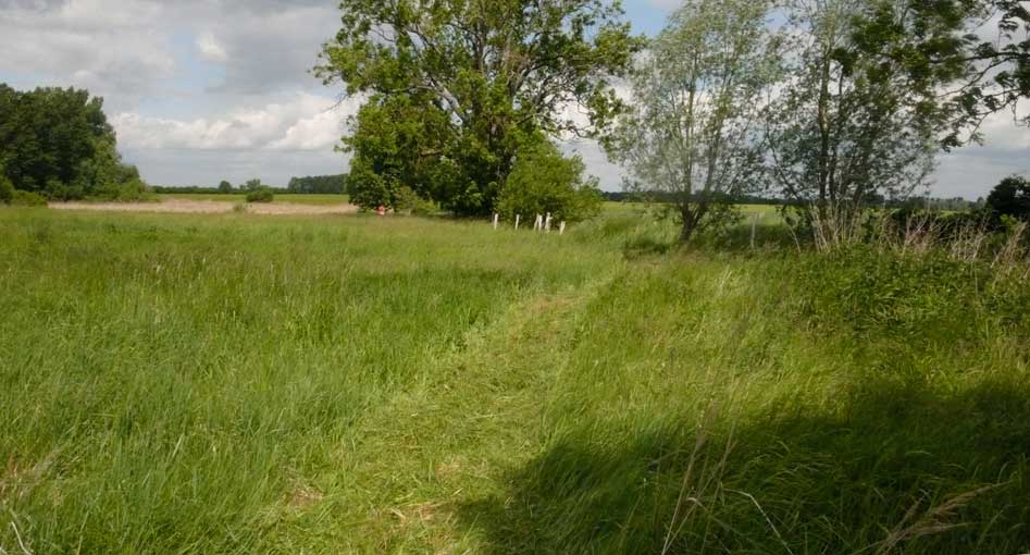 weich ist es zu gehen durch das Grün des Mai, links die Koppeln, rechts und geradeaus die Felder unter dem grauen Blau des Himmels