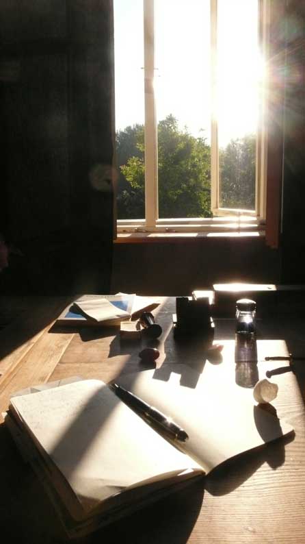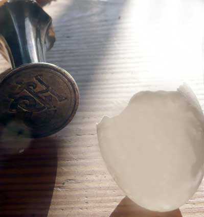 Diese Ei eines geschlüpften Taubenkückens, sorgsam von den Alten vom Nest entfernt, damit das Nest nicht markiert ist, fand ich vor der untersten Treppe unseres Hauses. Ich nahms als Dank von allen.
