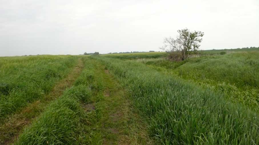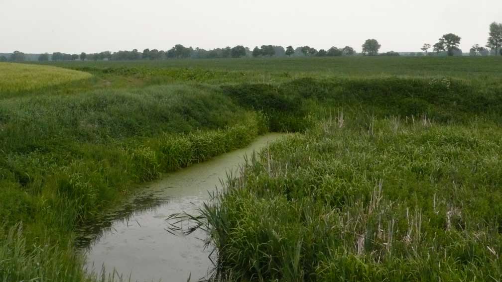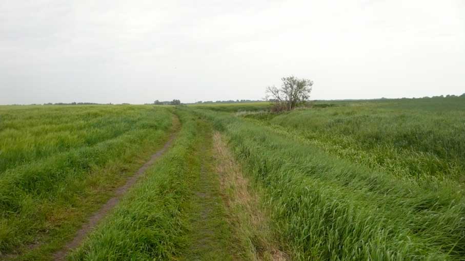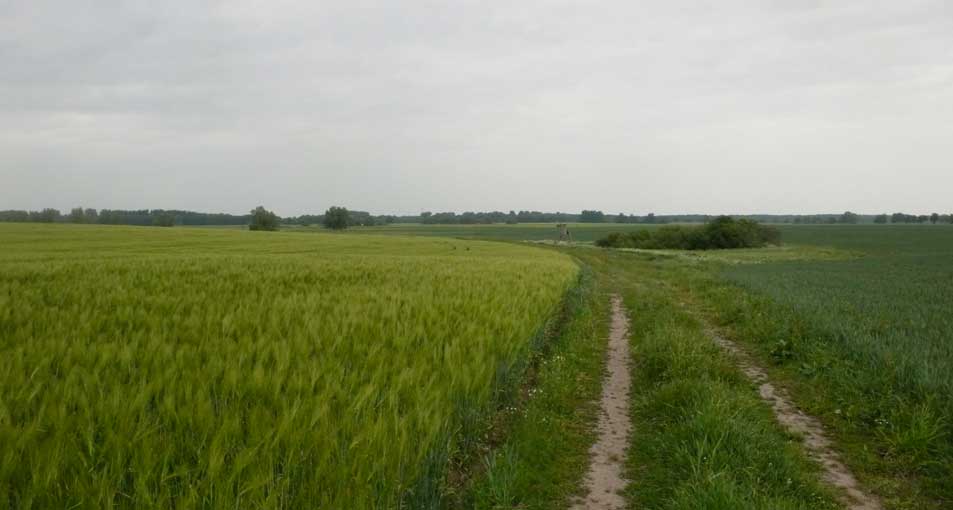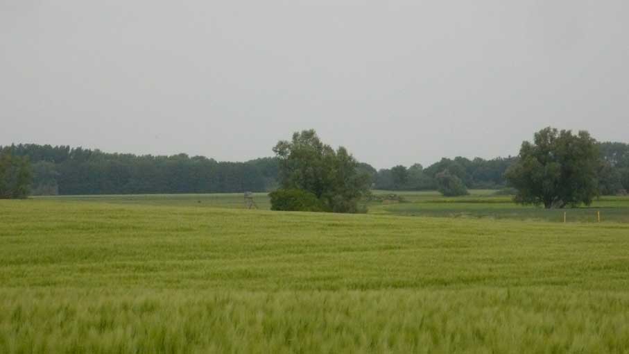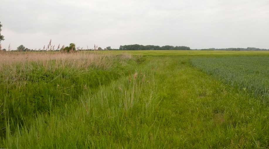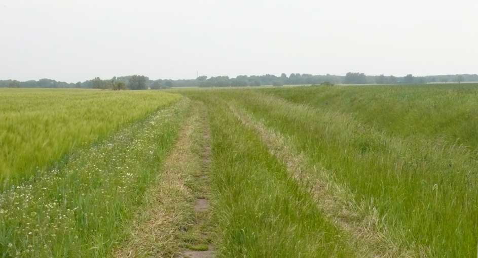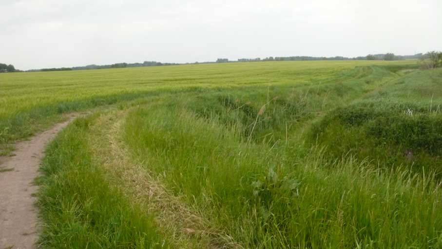 links das Korn iund rechts der Graben zum Wald in der Ferne
