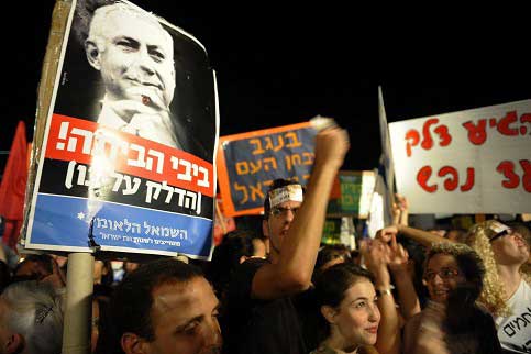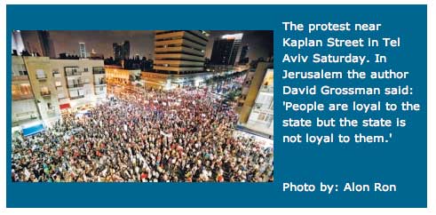 The protest near Kaplan Street in Tel Aviv Saturday. In Jerusalem the author David Grossman said: 'People are loyal to the state but the state is not loyal to them.'