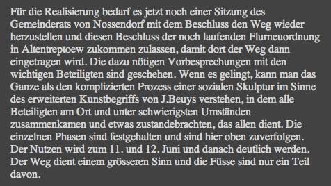 Man kann sagen, den Weg gab es schon vorher und seit Generationen gewachsen wie jetzt in Frage gestellt und wieder bewusst geworden. Dieses Bewusst-Werden aber ist vielleicht so wichtig wie die Wiederherstellung des Turms als Zeichen von etwas, um das es geht. Dazu bearf es manchmal gewisser Anstrengungen und Agenten, die das bewirken müssen. Die Beteiligten und Aktionen in entscheidenen Phasen dann am Ende. Sofern förderlich. Nun wäre auch die zurückgenommene Klage vor dem Verwaltungsgericht möglich, da durch Abschaffung des Weges persönliche Nachteile am Artefakt nachweisebar. Aber wozu, wenn gemeinsame Übereinkunft dienlicher ist.