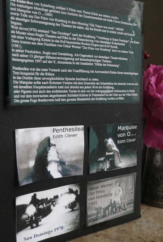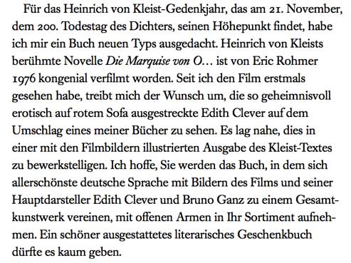 Es fallen da Worte wie "Gesamtkunstwerk"und "kongenial" für den Film in Verbindung zu Kleist und es wird das Buch als unvergleichliches "literarisches Geschenkbuch" erklärt, was es vielleicht auch ist, aber eines Kleist gemässen ? Das eben alles nicht. Aber erlassen wir uns hier die Gründe. Da es mit Grundsätzlichen zu tun hat, ist da viel zu finden. Und zu sagen.