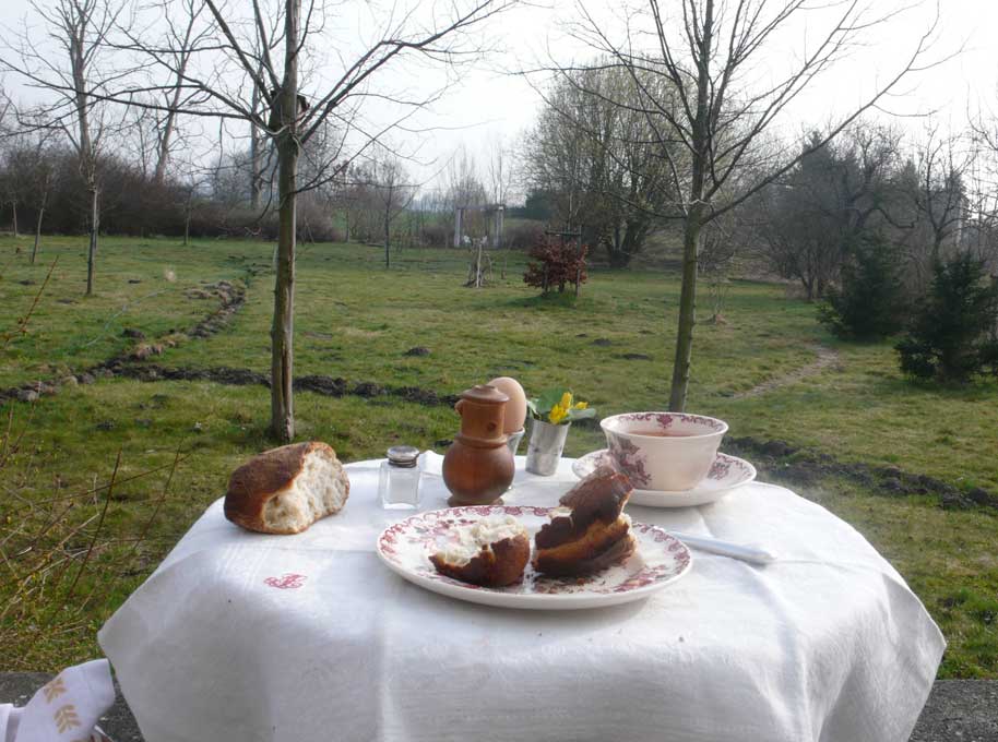 Wenn die ursprünglichen Gründe, warum wir hier sind nach und nach einbrechen, warum wir hier sind, stellt sich die Frage, was es denn ist, warum wir dann hier sind, gekommen und was uns dann hier hält, wenn die Eindrüche, auch der Erkenntnis nicht nachlassen und zentraler werden. Sicher es ist nicht die besonders attraktive Lage des Ortes, des Wetters oder der Menschen. Wir sind in einem verfluchten Land. 1989 nach dem ersten Anblick, was blieb, war es ein Alptraum, 2000 als ich mich entschloss wieder zu kommen, war es zu retten, was geblieben war, zuerst mit den schwierigen Nachbarn im Ort, dann mit den verlassenen Kindern dort, die alten Freunde der Kindheit sterben, oft noch im Leben, die jetzigen Besitzer des Landes rundum erweisen sich als schwierige Demokraten, die das Land und die Geschichte verbrauchen, die früher geschaffene und gepflegte, die Natur ausbeutend, kein schönes Bild, warum also sind wir trotzdem da. Was ist es ausser das Kommen und Gehen der Jahreszeiten., was woanders auch und freundlich geschieht, obwohl das, was früher ernährte nur kostet, Was ersetzt alles. Nur ein gnadenloses Trotzdem, Wir sind in einem verfluchten Land, an der Wurzel der Dinge. Ist es das, wo wir die schlimmsten Alpträume bestehen müssen, ist es an den Punkt gekommen zu sein, wovon alles ausging, auch ohne Menschen und Gestalten, die wir als die Welt sahen, in jämmerlichen Zustand, Verammte der der Deformation innen und aussen, ist es das zu wagen, was verboten ist, die Erfindungen der Gedanken wahrhaftig zu gestalten. Jenseits längst der hiesigen Welten. Nach zu denken viel. Vor zu denken auch. Manchmal gibt es Überraschungen, freudige, halten wir uns an sie. Und das kommt dann aus eben diesem tiefsten Grunde und hat alles andere längst hinter sich, einen eigenen Sinn. Von hier und da aus ist auch der Blick aus der Proszeniumsloge des Weltschehens auf besondere Weise möglich. Aus der Leere sieht man gut. Auf das Volle, Falschen Lebens.