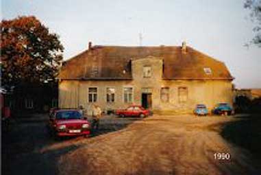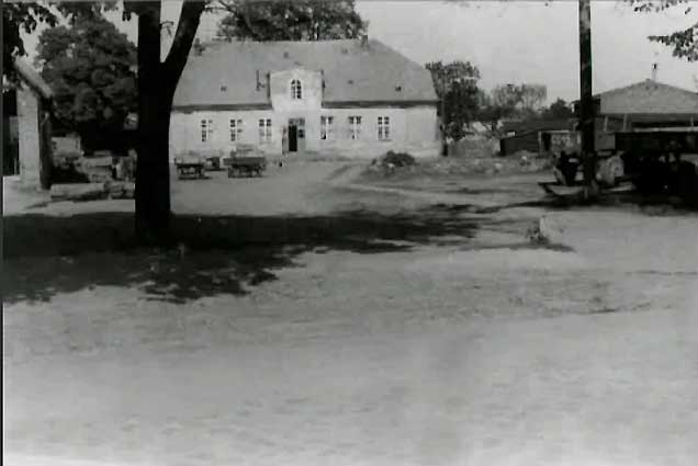 was sehen wir: vorne keine Pfeiler mehr des Hofes, aber noch das alte Plaster, rechts der Kuhstall ist schon weg also nach 1950, die Scheune links noch erkennbar und hinten die Linden hinter dem Haus noch da.