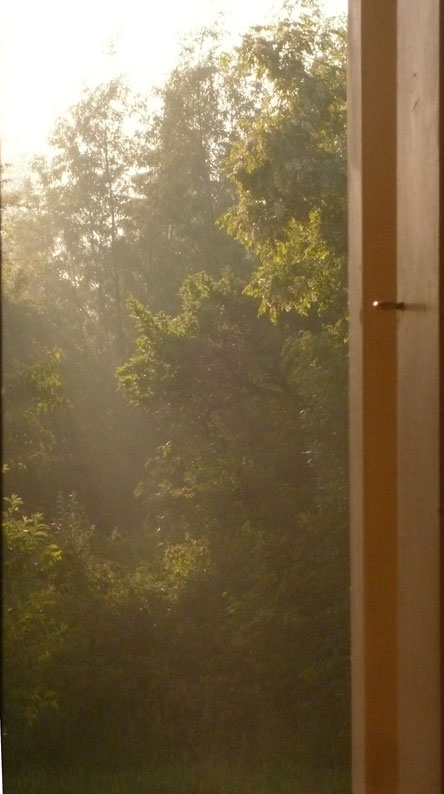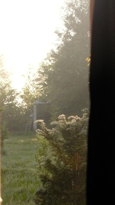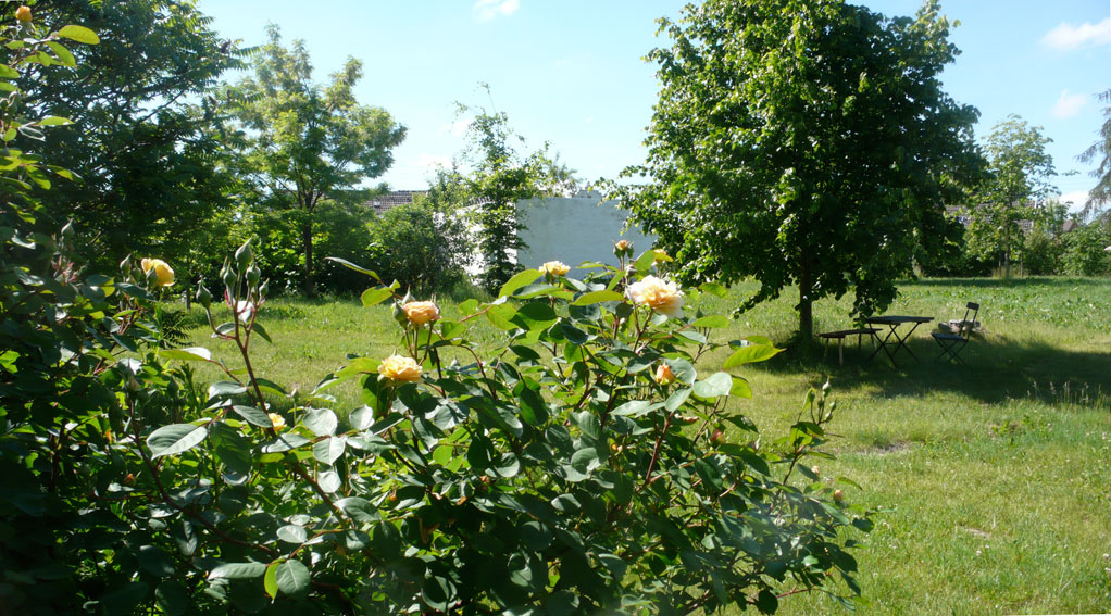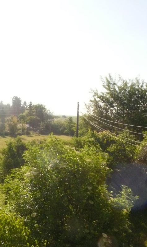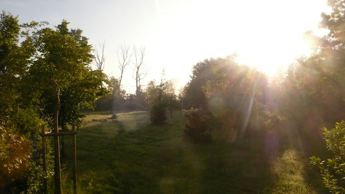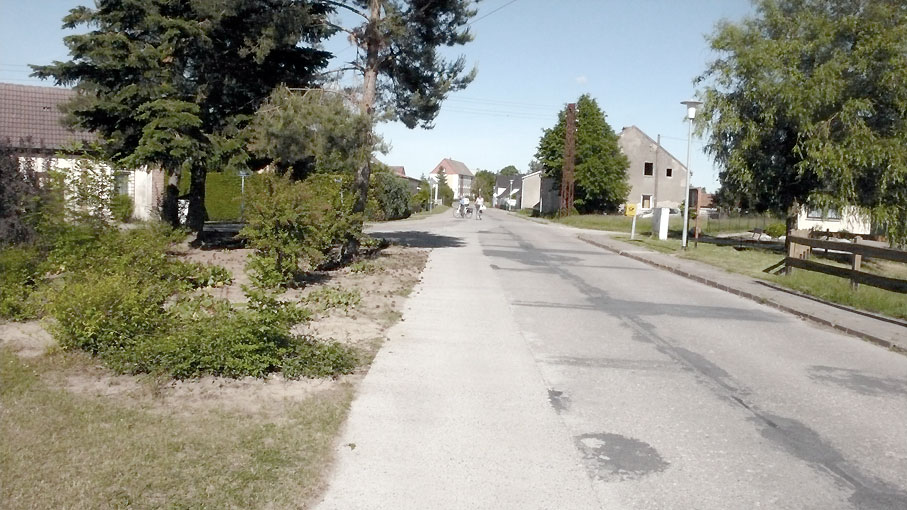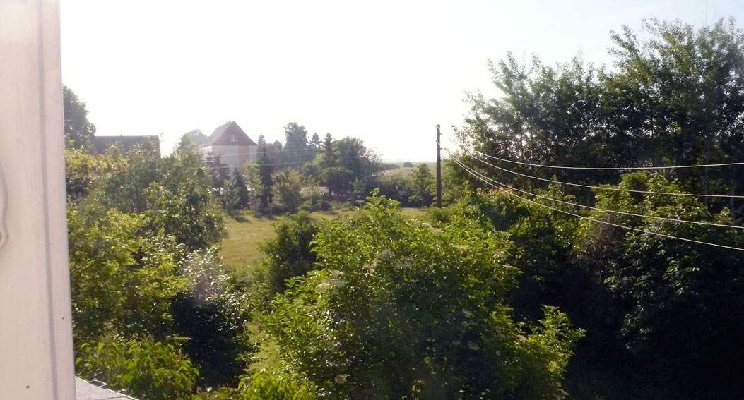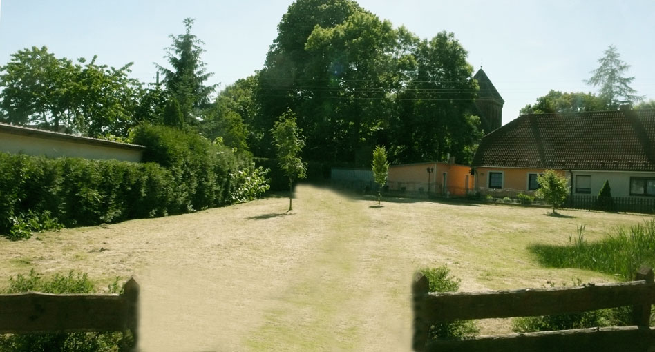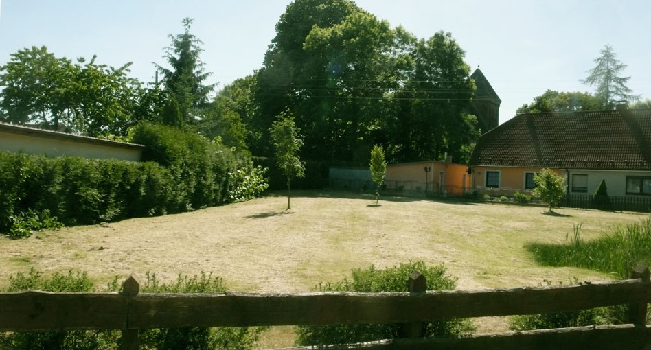 Das ist im stummen Bilde trügerisch, denn hinter den Bäumen kommt der Ton vom Sportplatz durch die ganze Nacht, mit allen Fenstern zu und ohne Erbarmen. Was den Rasenmäheren ab 18 Uhr und am Wochenende untersagt ist, jeder Grashalm vor der Tür verfolgt wird, alles Feuer ausserhalb der Zeiten verboten sind,was im Fernsehn als Freiheit des Knopfdrucks garantiert ist, wird hier durch öffentliche Beschallung zur Diktatur der Apparate. Des Bürgermeisters liebstes Kind. Bald mit Fluchtlichtanlagen, künstlichem Rasen für 15 000 Euro gefördert im Visier, dann immer, Tag und Nacht. Zwischen den Feldern. Das Land holt auf, Mitten in den Feldern. Die jungen Leute sollen auch mal gefördert werden. Und wer wollte gegen die Jugend sein.
