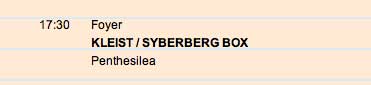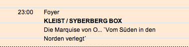 Dann der Gedanke der stillen Behauptung im Bereich einer Enklave doch. Box-Situation im abgeschiedenen Raum des Foyes(ehem. Singakademie aus Kleists Zeiten) einsam vielleicht möglich. Als Nachrichten aus der Box Kleistgewidmet seit langem. Abituraufsatz zu Kohlhaas, zweimal, da beim erstenmal durchgefallen(Text noch erhalten, in Handschr.1956/Petershagen