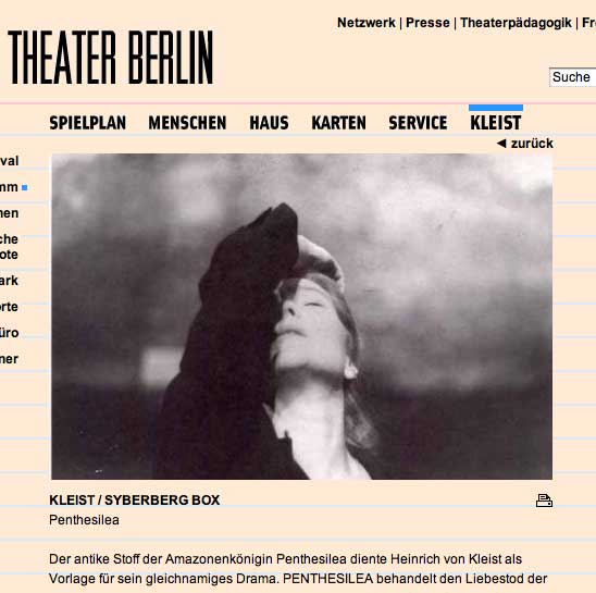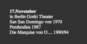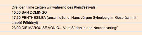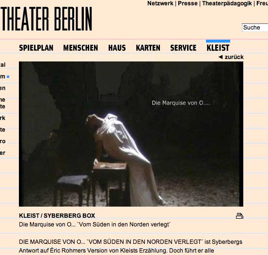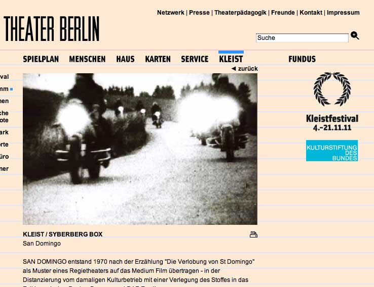>, eines der aus dem Osten kam im Westen nun), aber dank Kleist nochmal. Dann 1970 SanDomingo in kritischer Situation mit kritischer Ästhetik, zusammenzusehen mit 8mm Filmen bei Brecht, zur gleichen Aktion herausgebracht(Kommentar zur Filmsituation der Zeit! vor dem rev. Ludwig-Film also) und dann die beiden grossen Edith-Clever-Monologe Penthesilea und Marquuise von O... in den 80er Jahren und als Abschluss dazu der Homburg im Traum-was-sonst als Ende des Theaters das hier mit Brecht und Kortner begann, sowie als Zugabe der Schwanengesang des Oskar Werner mit seinem Homburg-Dokument von 1881 vor dem Tode.