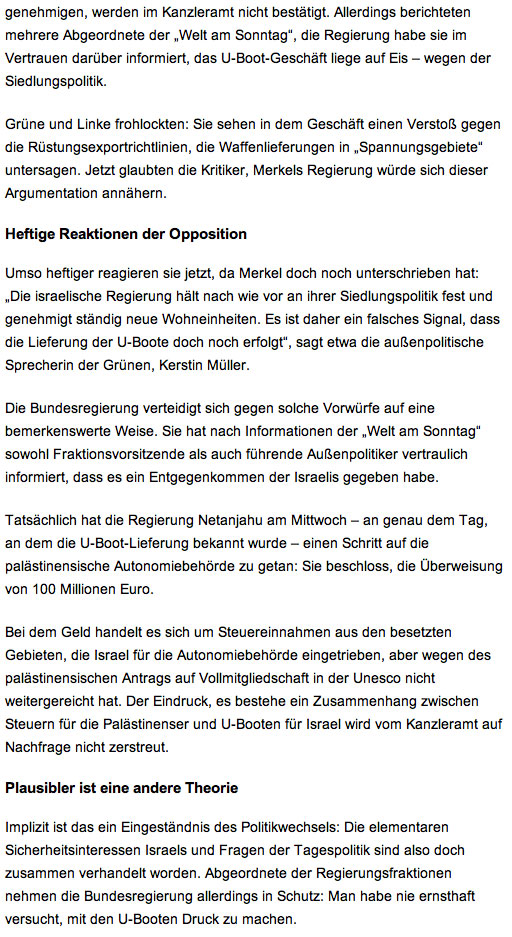 Merkel warf Netanjahu vor, sich nicht an Absprachen zu halten. Israelische Berichte, die Kanzlerin habe persönlich gedroht, das U-Boot nicht zu genehmigen, werden im Kanzleramt nicht bestätigt. Allerdings berichteten mehrere Abgeordnete der „Welt am Sonntag“, die Regierung habe sie im Vertrauen darüber informiert, das U-Boot-Geschäft liege auf Eis – wegen der Siedlungspolitik.