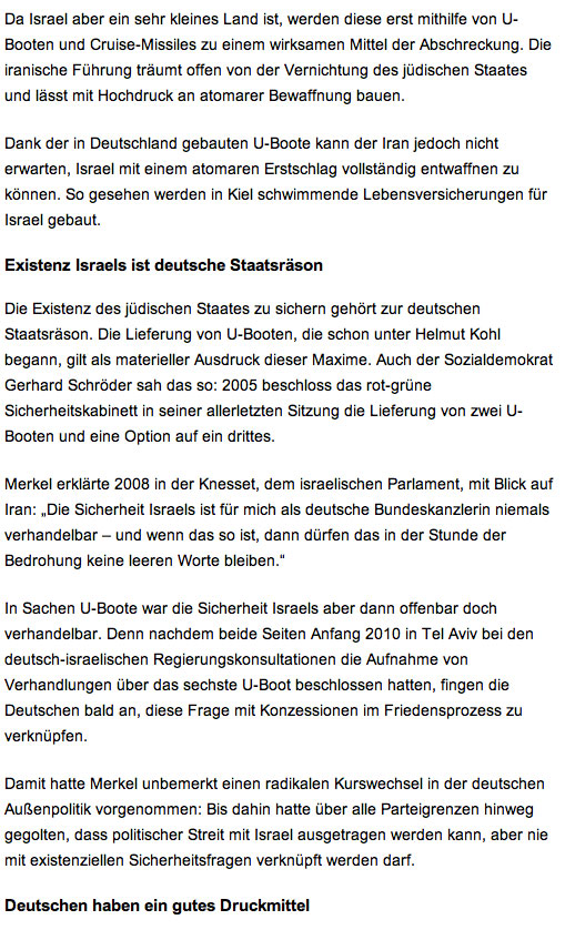 Dank der in Deutschland gebauten U-Boote kann der Iran jedoch nicht erwarten, Israel mit einem atomaren Erstschlag vollständig entwaffnen zu können. So gesehen werden in Kiel schwimmende Lebensversicherungen für Israel gebaut.