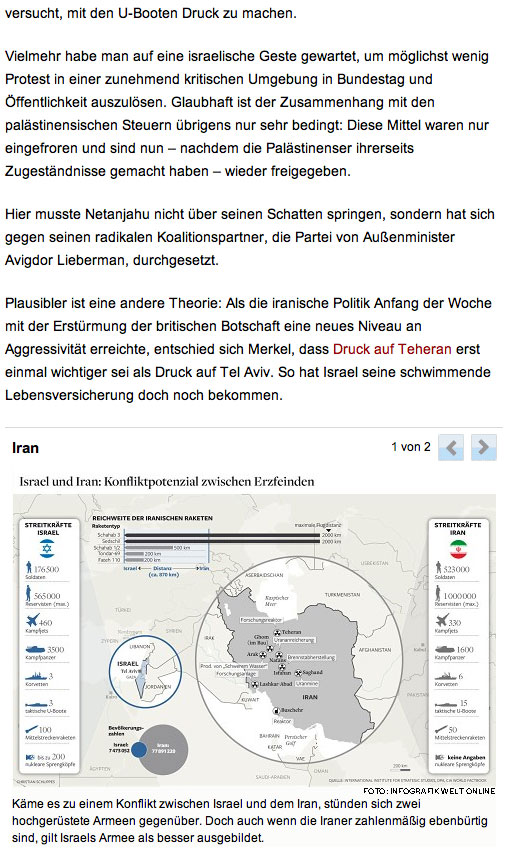 Plausibler ist eine andere Theorie: Als die iranische Politik Anfang der Woche mit der Erstürmung der britischen Botschaft eine neues Niveau an Aggressivität erreichte, entschied sich Merkel, dass Druck auf Teheran erst einmal wichtiger sei als Druck auf Tel Aviv. So hat Israel seine schwimmende Lebensversicherung doch noch bekommen.