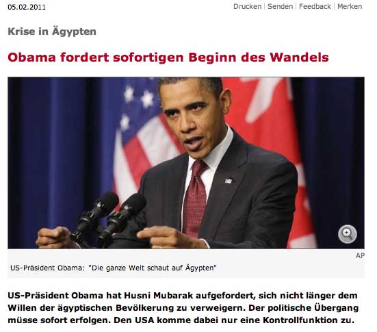 wann endlich sagt das einer laut auch über die Mubaraks in Israel:"Sie müssen Ihre Politik revidieren. Sie müssen sich von Mubarak lösen. Sie müssen Vertrauen zum Volk bilden und nicht zu den Leuten, die das Volk ersticken." Mubarak sei ein "dead man walking", fügte er hinzu, mit einem flotten Idiom aus der US-Popkultur - ein "wandelnder Toter".