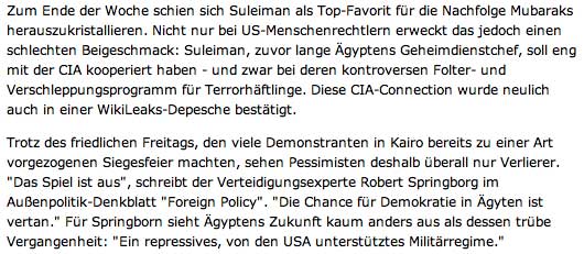 Suleiman aber ist Mossad. Den wollen sie haben. Das ist Mubark jun. Darum das Feilschen in Washington und Black outs der elektronischen Verbindungen ?