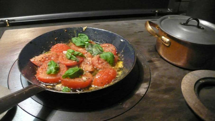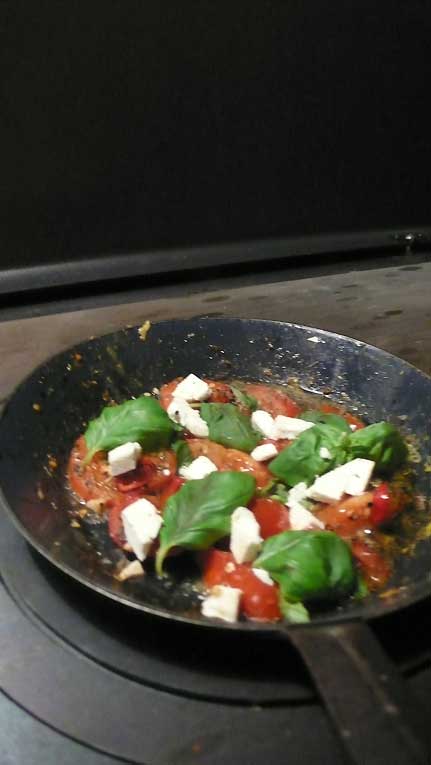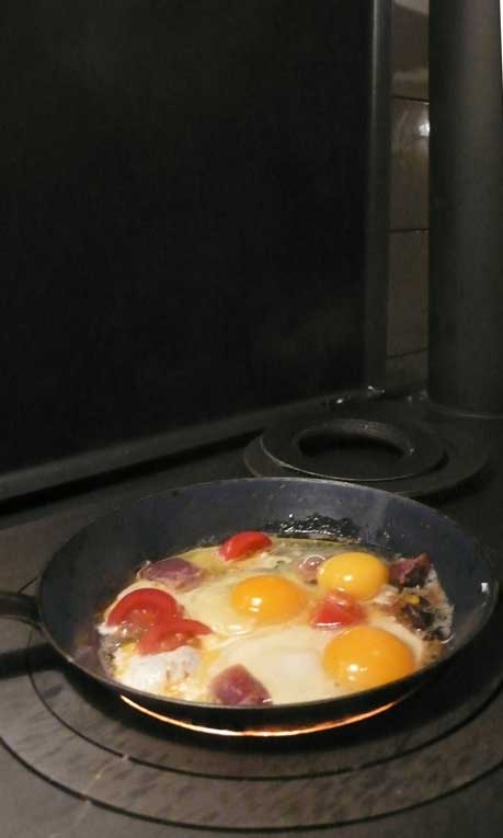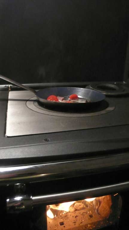 mi der erhaltenen Pfanne aus der Zeit der Studiums in Müncehn von 1956- 1953 mit alten Materiialien fürs Feuer gemacht, tut ihre Dinste.