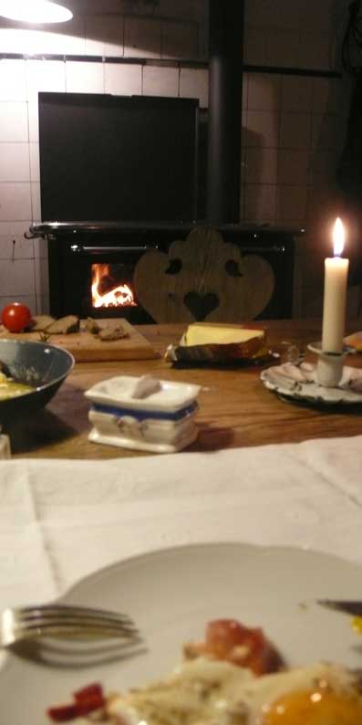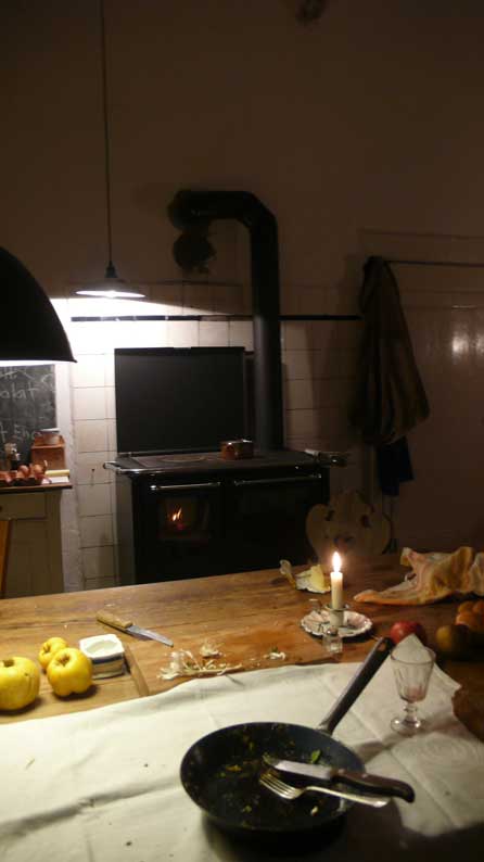 So war die Wärme der Küche im Reich der Köchinnnen des Lebens im Nossendorf des Kindes und in Briol später bei der Hermia jeden Morgen und Abend,Winter wie Sommer immer in Grundlsee in Österreich bei Frau Trautner im Seeblick. Der Geruch von Feuer und guten Dingen des Essens zusammen machten die Küche zum Zentrum des Hauses. Und jetzt also in N. wieder aus uns selbst.Mit der Geräten des Lebens aus Pfannen und Stühlen um uns. Von da und dort. Nun hier.