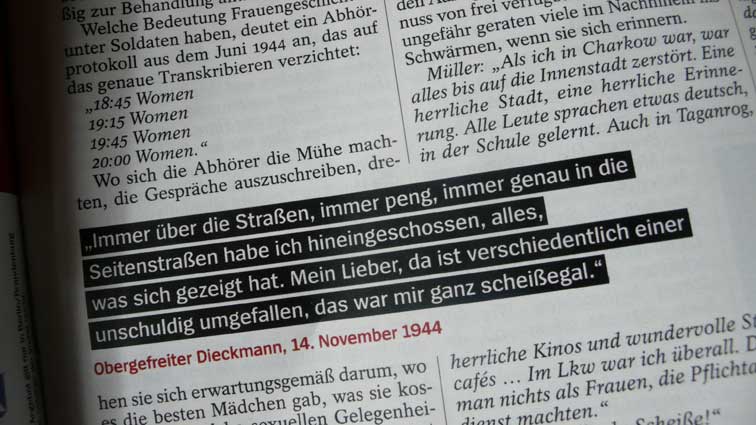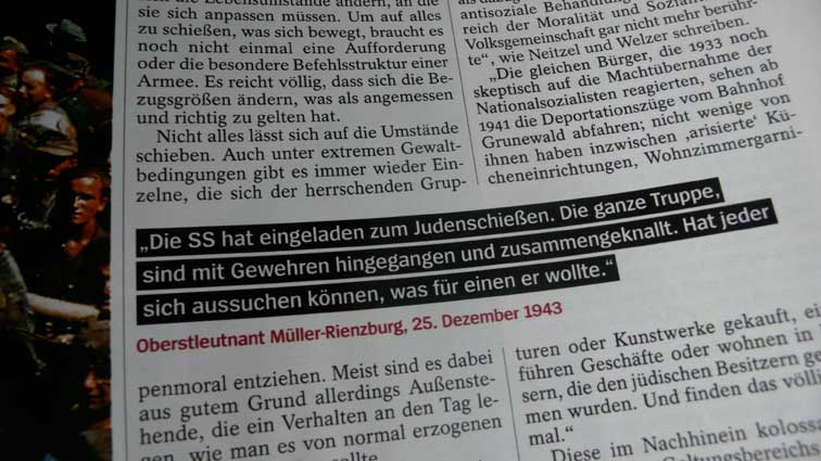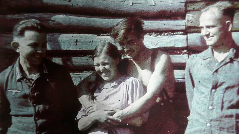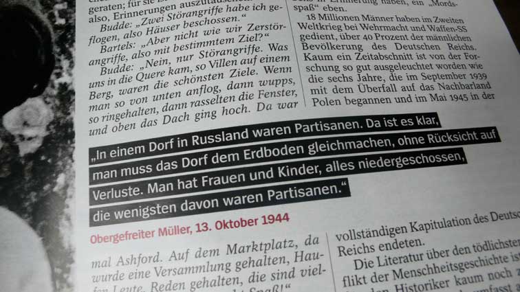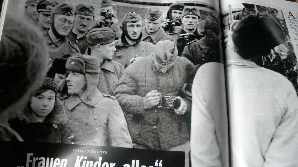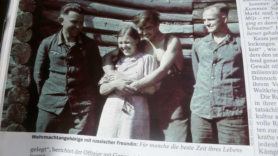 Ein harmloses Bild - wie es scheint. 3 deutsche Soldaten mit einem russischen Mädchen in der Ukraine, wie darunter steht. Im Spiegel. Wenn nicht die Erinnerung wäre an jenen Taxifahrer R. aus Südtirol, der mich vor einigen Jahren von den Bergen des Sommers zum Flugplatz in Insbruck fuhr, und der, als sich sagte es sei auf Einladung des ORF und einer Runde zum letzten Kriege, mir lachend und gerne auf den Weg gab, was er erlebt.