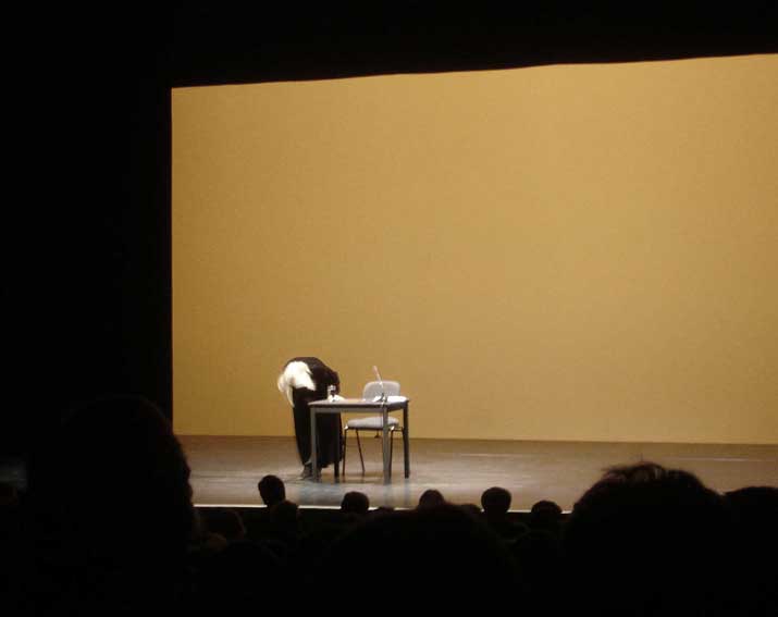 auf die Bühne in der Akademie der Künste, setzt sich, begradigt