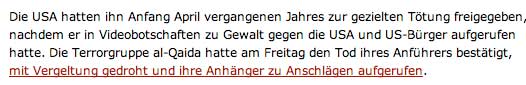 Was würden wir sagen, wenn die Russen oder die Chinesen in anderen Ländern ihre Feinde aus der Luft erledigten ohne Gericht und dazu sich zeigen, indem sie live die Liquidation ansehend veröffentlichen, wie Hitler sich die Tötung seiner Gegner vorführte - aber allein und geheim und danach.