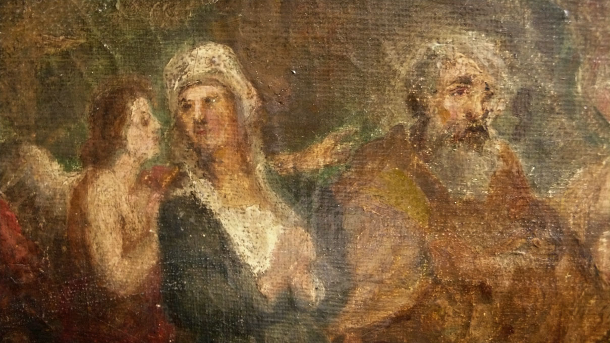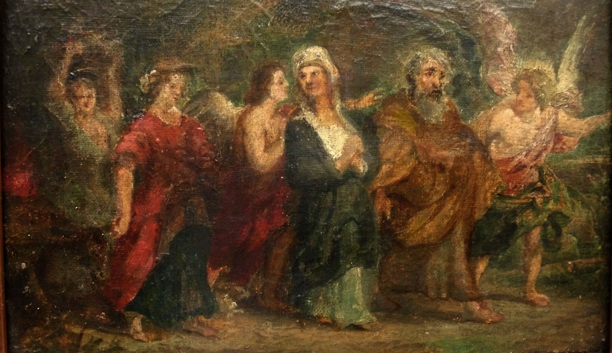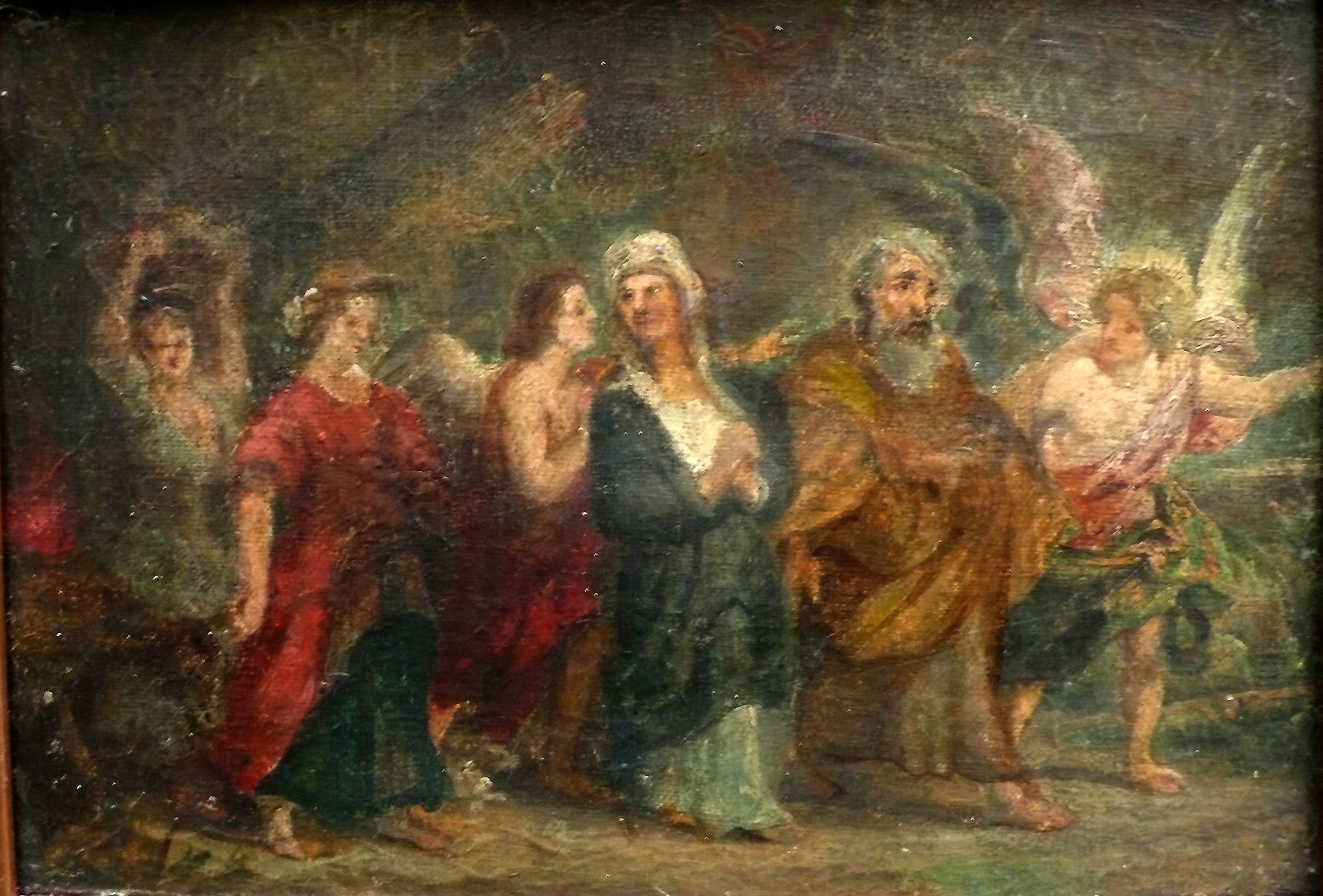 Und dann die Vertreibung von Loth und seiner Frau, die sich gleich umsehen wird, mit den Töchtern aus dem brennenden Sodum , von den Engeln geführt. NachRubens(in Paris) schon nebeneinander alle noch. Wohin.