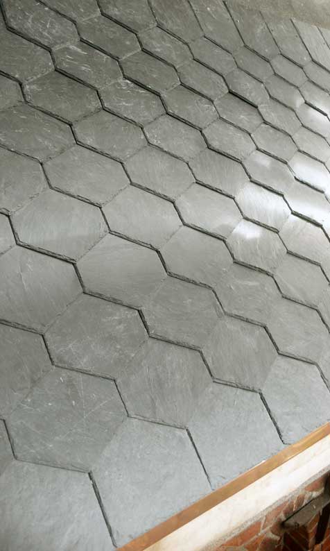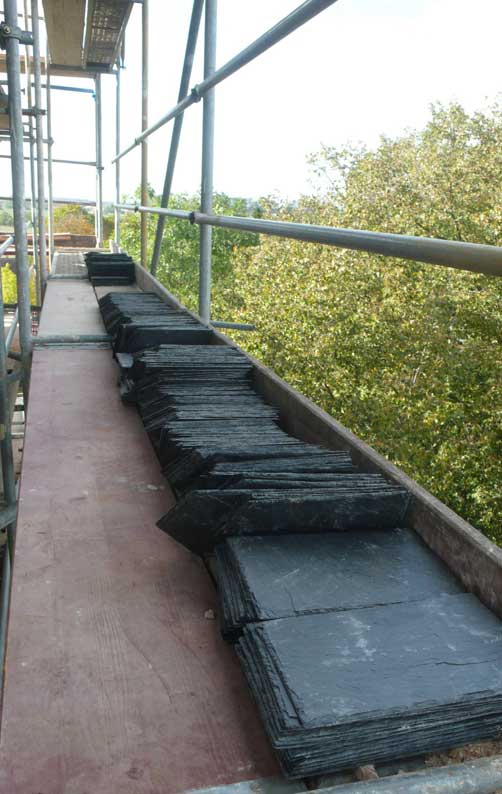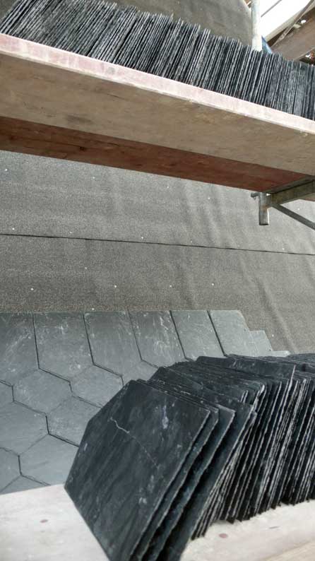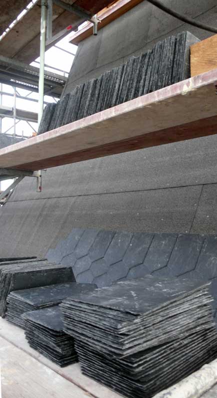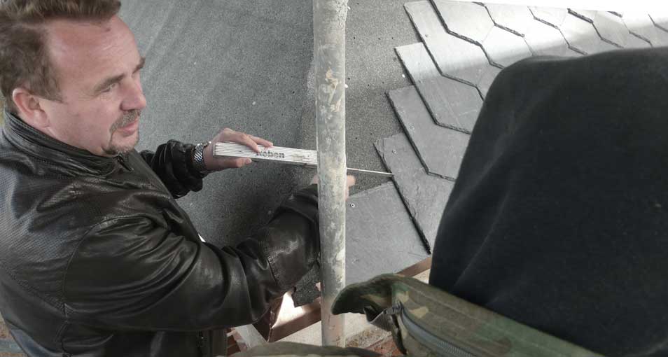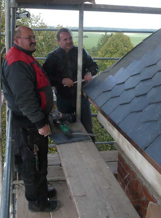 Das Decken des Dachs mit Schiefer der Fa,+. Rathscheck/Mosel und Beratung durch deren Sachverständigen