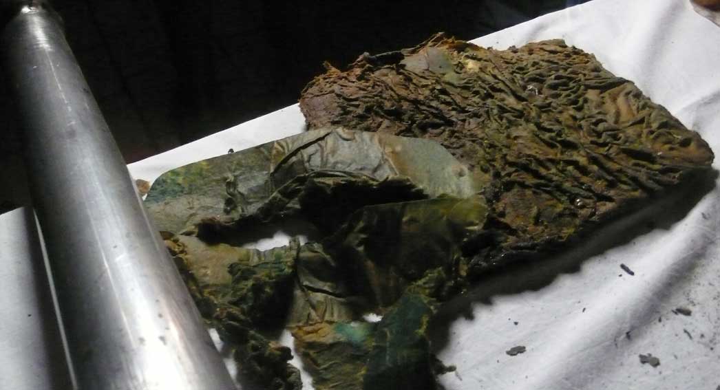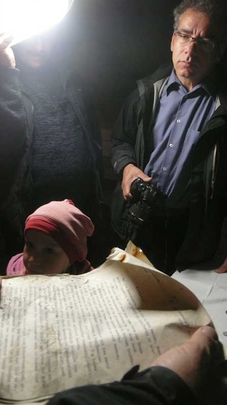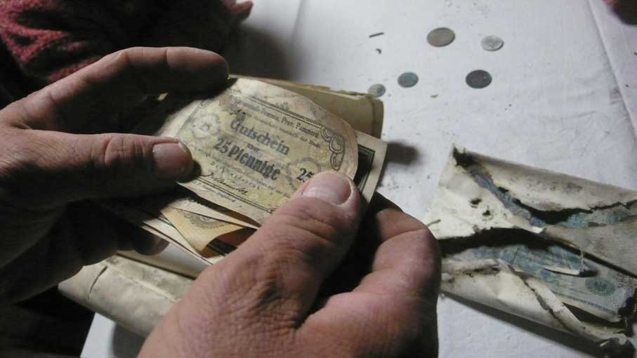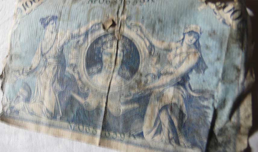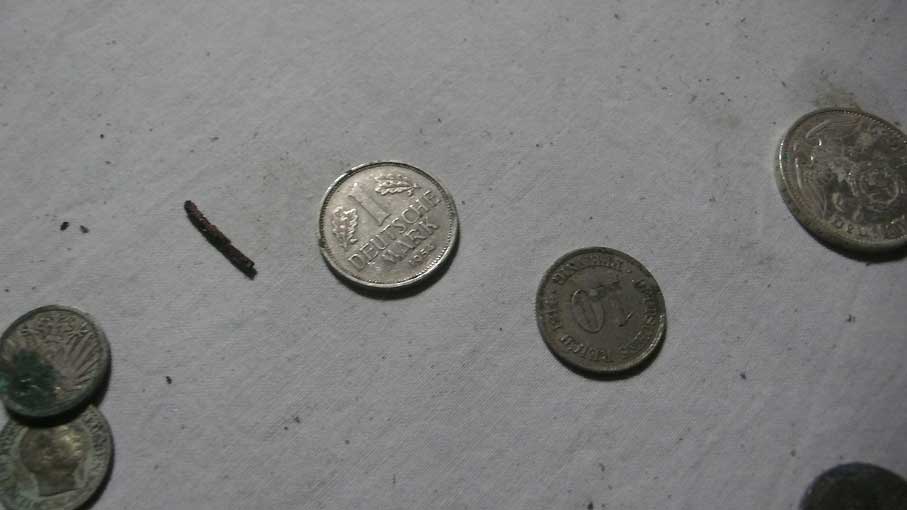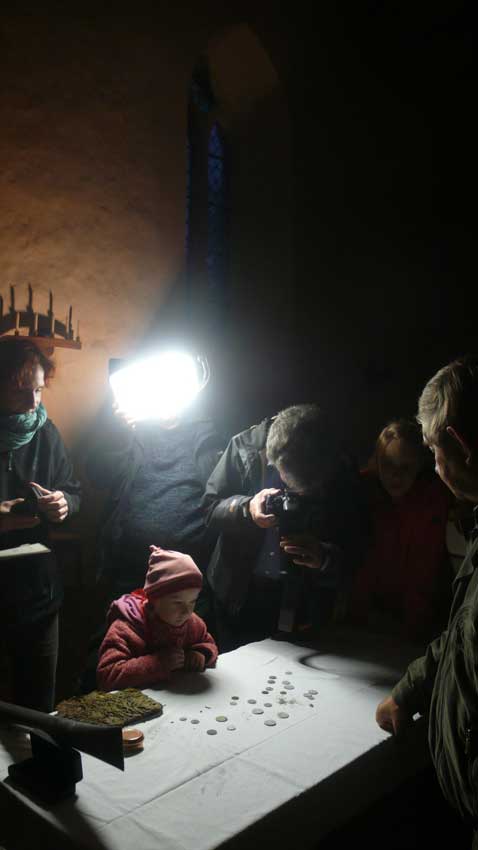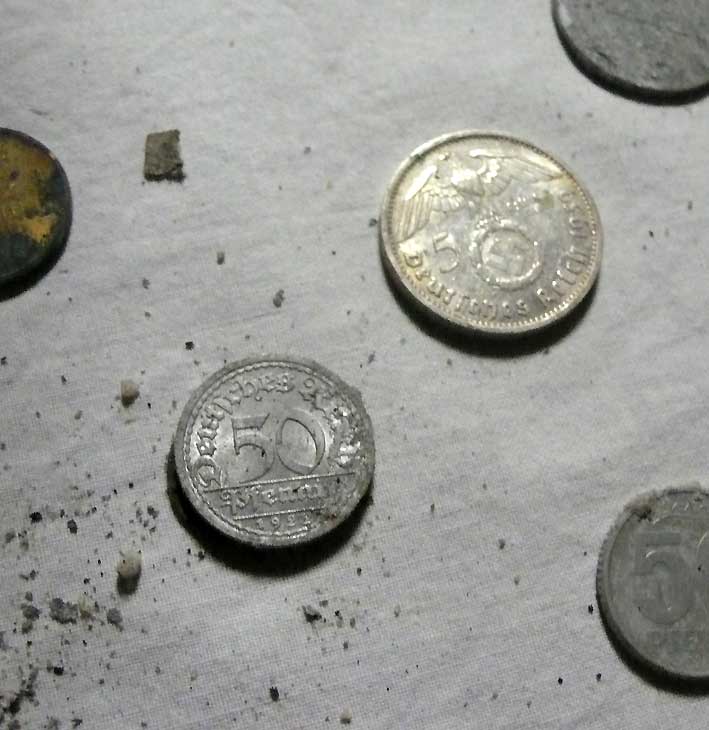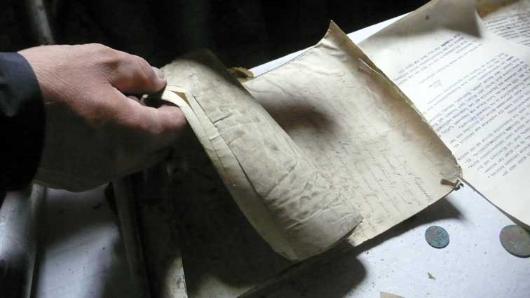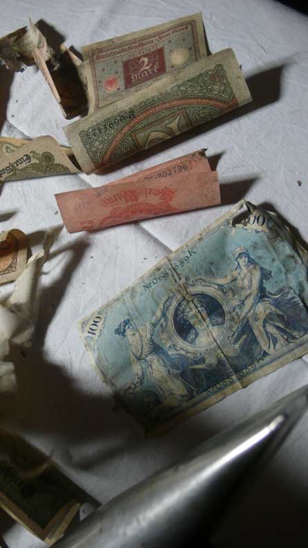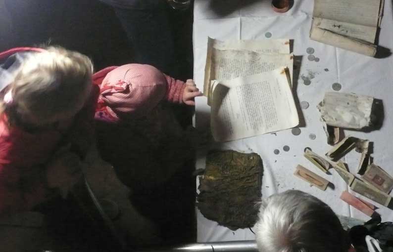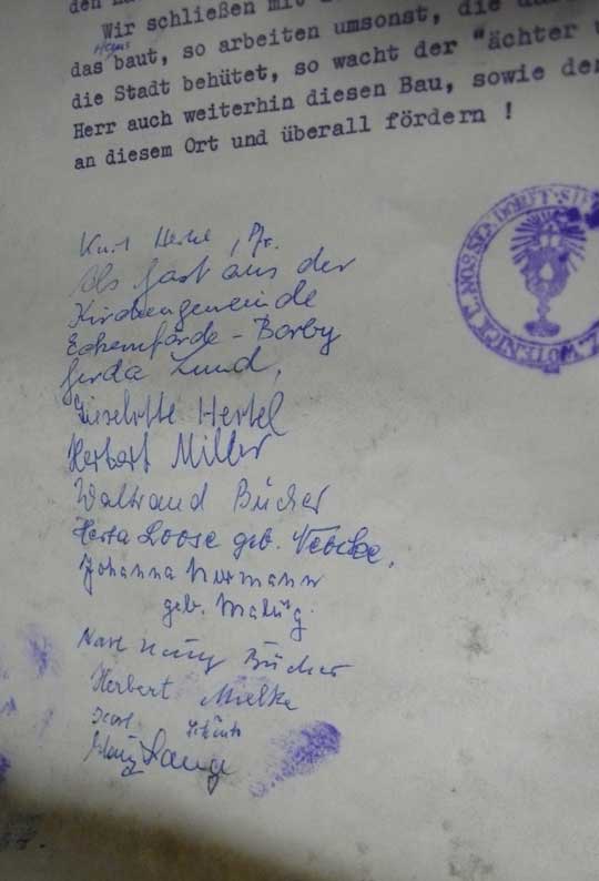 Dokumente aus den verschiedenen Öffnungen. Geschriebene Berichte mit Hand , mit Maschine, Geld durch die Zeiten von Kaiser Reich. 20er Jahre-Infl. und 3. Reich bis DDR und DM (Spender) des Neubau Turm vor dem Abriss, damit die Enbleme der Zeit, Zeitungen ("Freie Erde")der letzten Öffnung 1980 bis zur Unkenntlichkeit zusammengeschmolzen,.