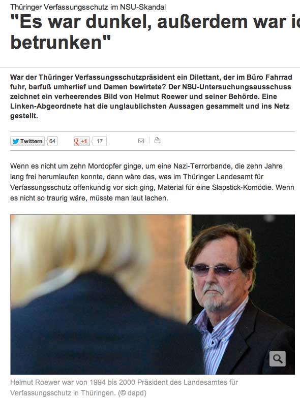 Die stŸmperhafte Arbeit der Erfurter Behšrde war am Montag Gegenstand im NSU-Untersuchungsausschuss im ThŸringer Landtag. Der einstige PrŠsident des Landesamtes, Helmut Roewer, wies jede Verantwortung von sich. Sein bemerkenswerter Auftritt ist in diesem SZ-Artikel nachzulesen.