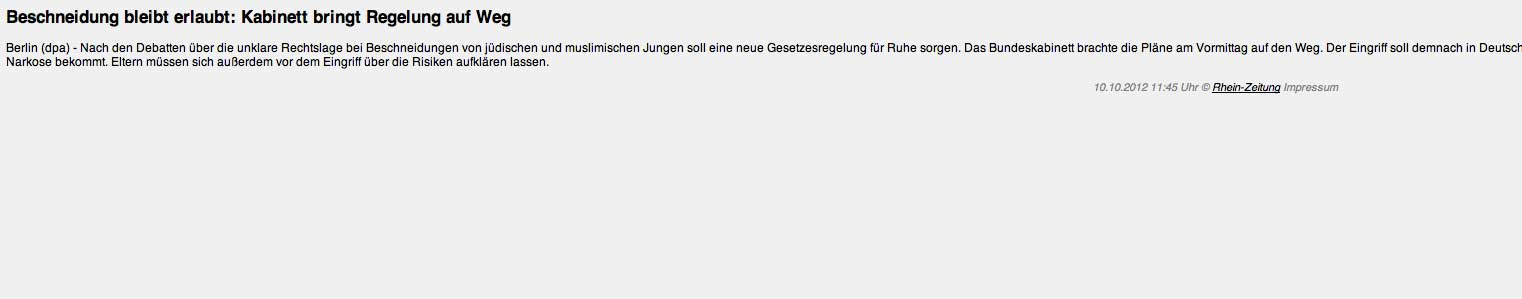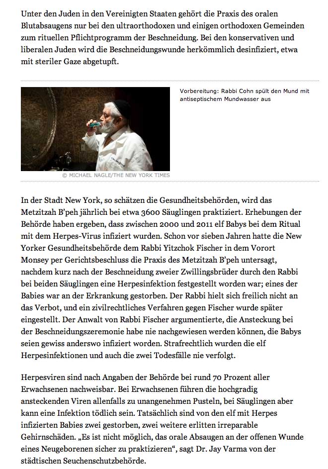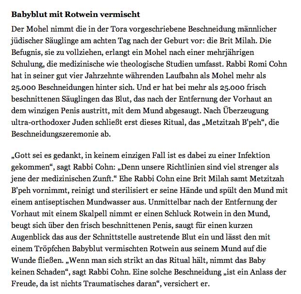 Dass eine religiöse Gemeinschaft sich heute unverständliche Rituale erhält, ist unter uns als Nachbarn und Partrner schwer zu tragen. Da sich aber eine weltiche Identität mit nationalem Staatsanspruch ihre Identität auf diese Weise einer rassistischen Funktionärs-Ideologie mit religösem Überbau unter uns im Rechtsstaat mit Kinderschänder-und Missbrauchs-Regeln zu halten versucht, wird sie sich nicht halten können.