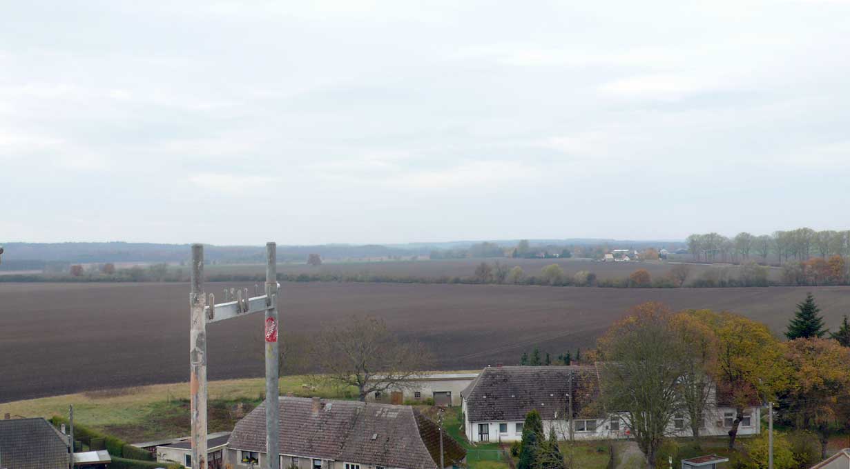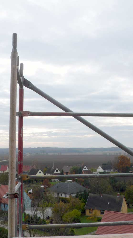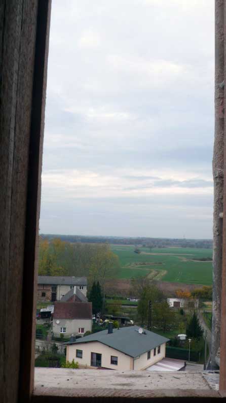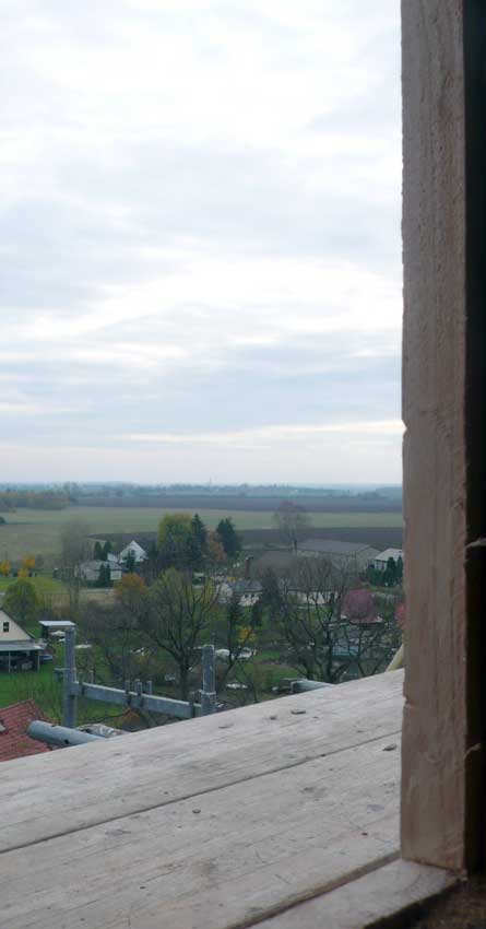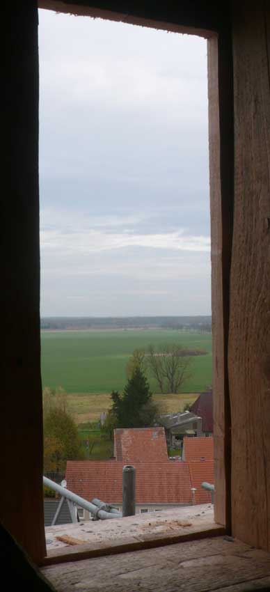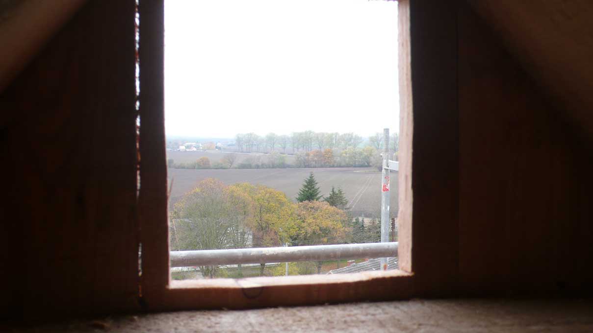 zur Wetterseite mit kleiner Öfnnung aber von nahe mit vollem Blick auf die Pappeln, die gerettete Allee.