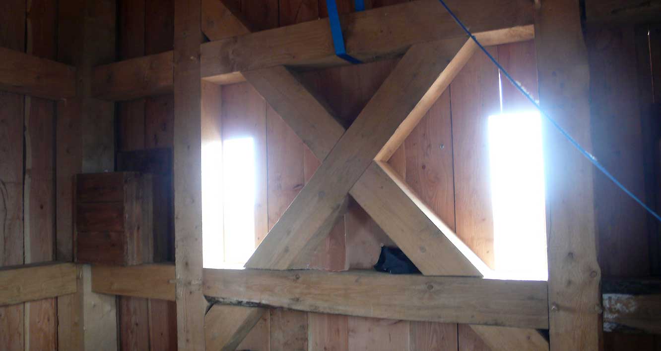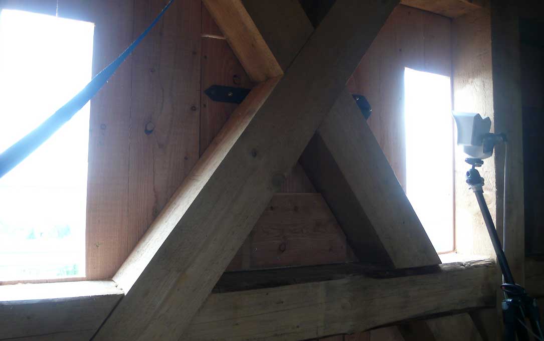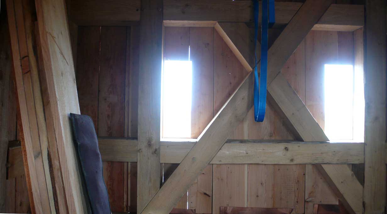 in alle Seiten zu schauen, die kleinen schmalen Öffnungen, wenn wir sie öffnen. Und wir sehen die Achse vom Turm zum Haus, in den Lüften frei. So viel Aufwand, um wieder frei zu sein