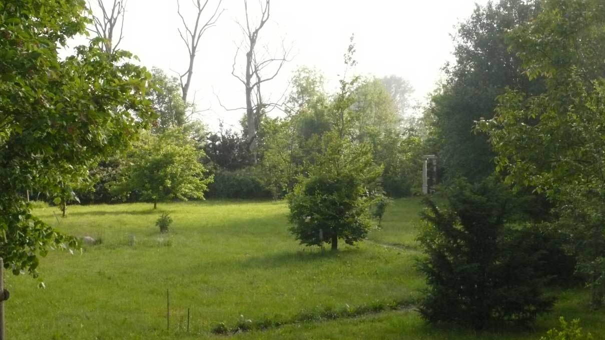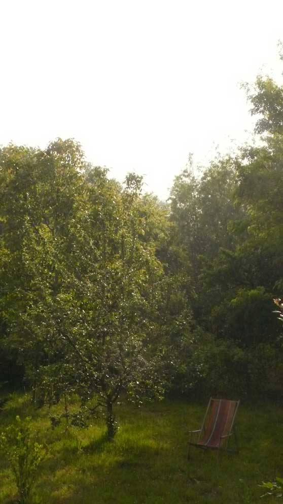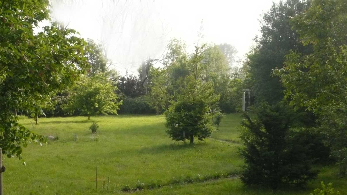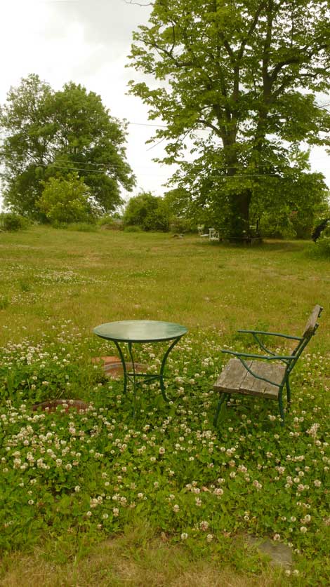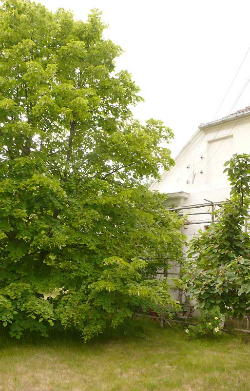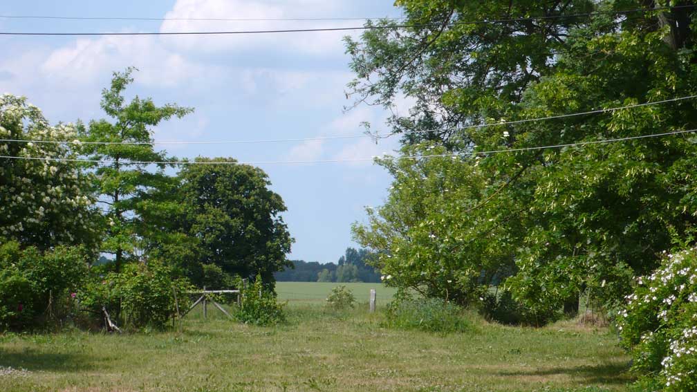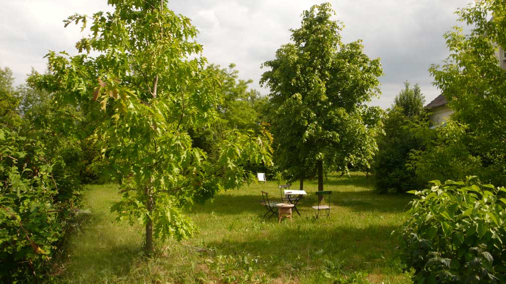 Der Blick vom mittaglichen Sitztplatz unter der neuen Linde vor dem Haus