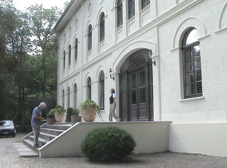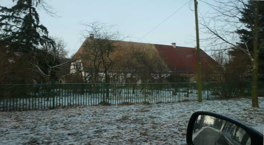 Seitwärts links und rechts die aus Scheunen umfunktionierten Häuser den Menschen nun an der alten Auffahrt
