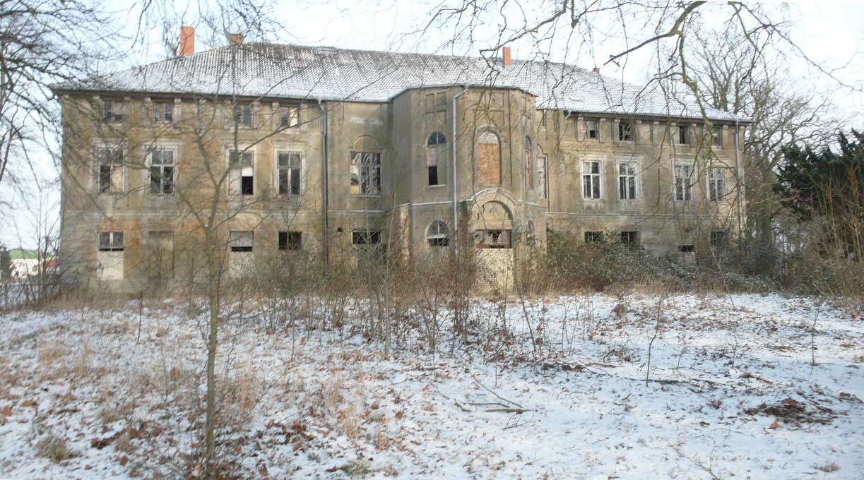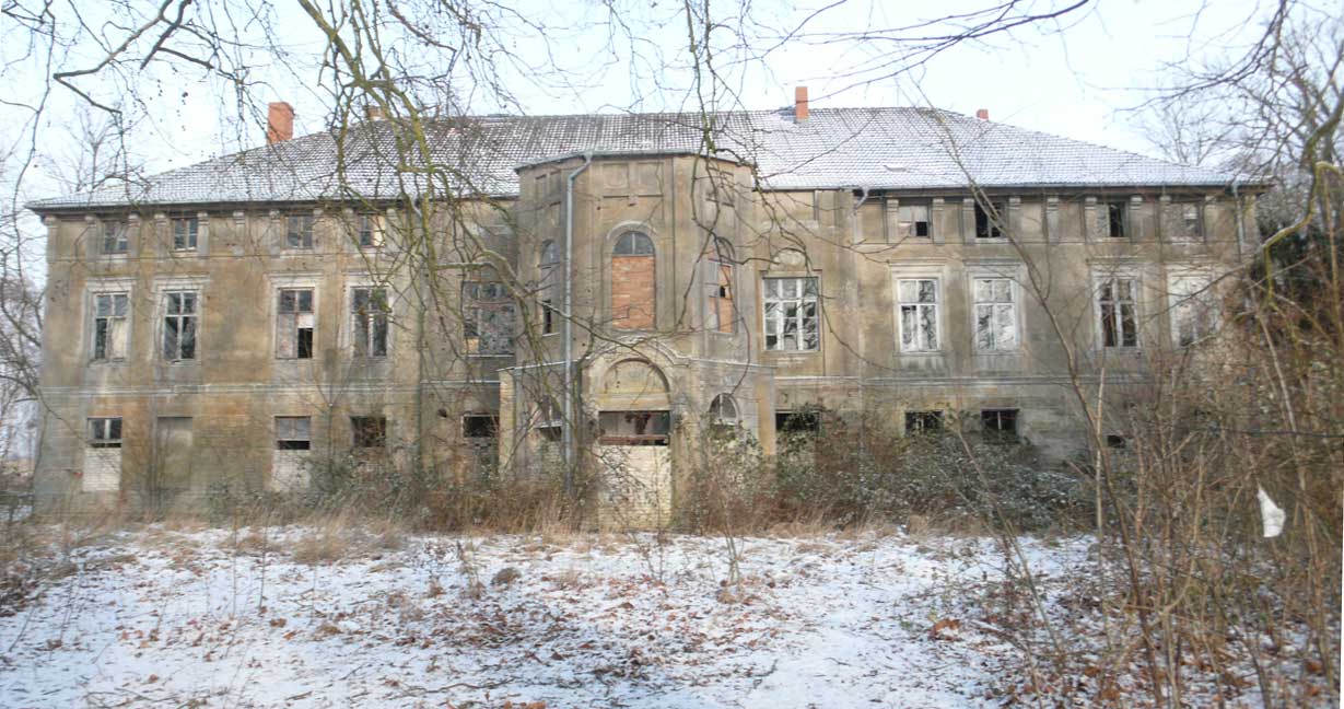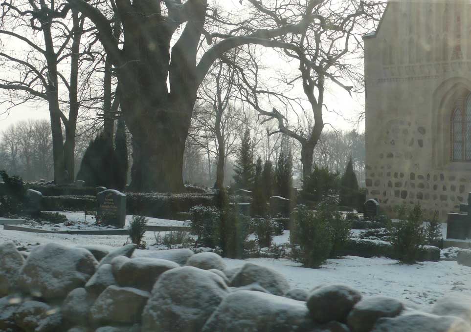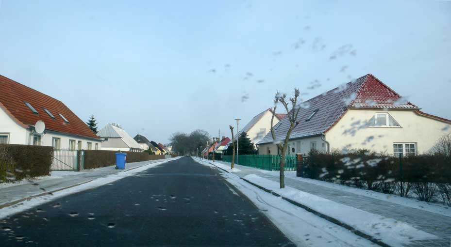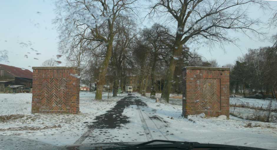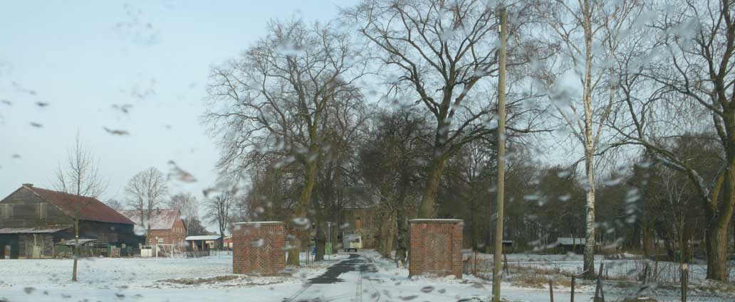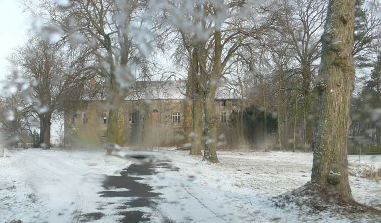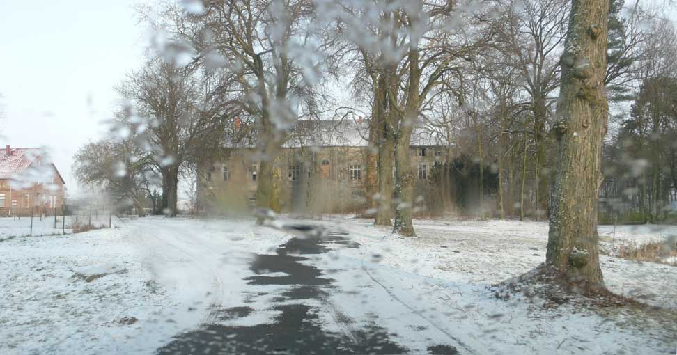 In Medrow geht der Weg aus dem Wald gerade zu zum Schloss. Vorne nach der Überquerung der Landstrasse zwischen Demmin und Grimmen, die beiden Kreisstädte, damals, haben sie die Bäume der alle nun ersetzt durch Rotdorn, ohne viel Blätter und ohne lange Wurzeln. Hinten sieht man schon die Auffahrts-Alle der anderen Welt. Noch immer. Allein das.