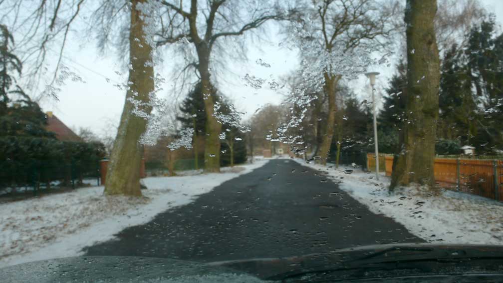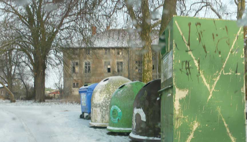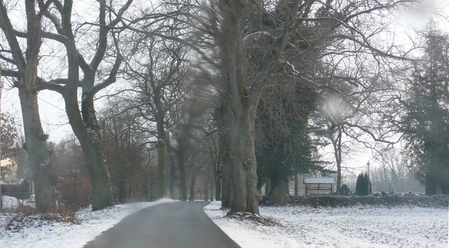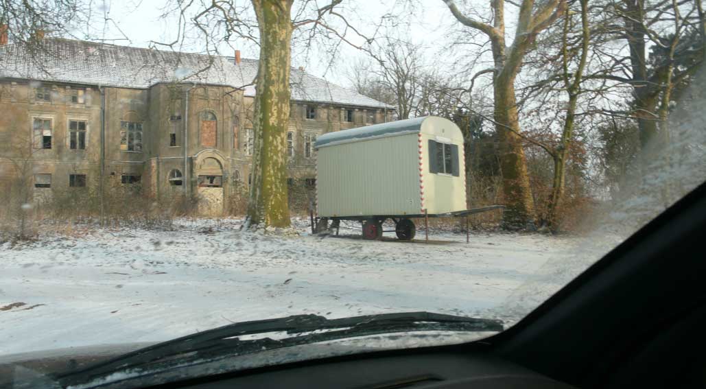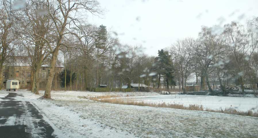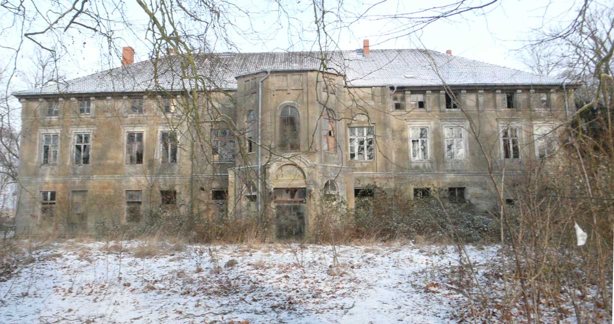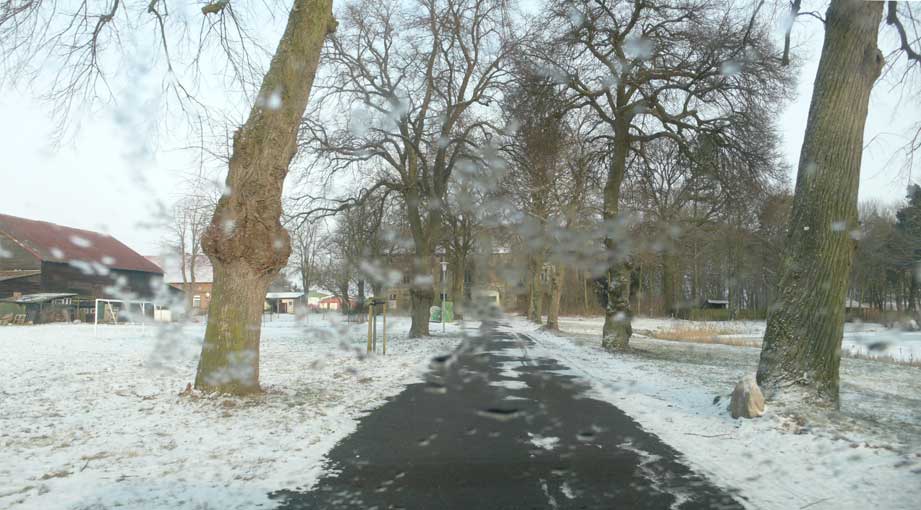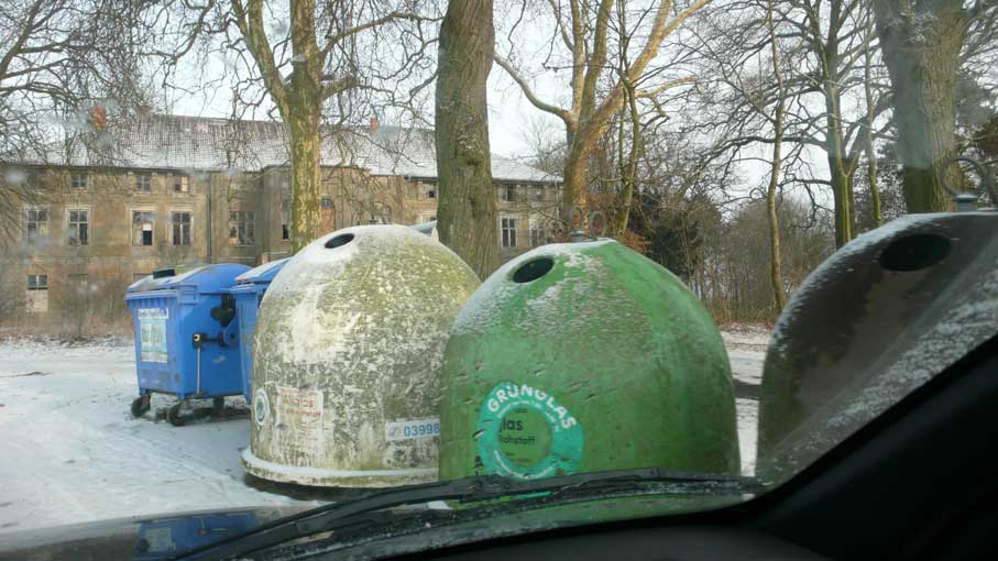 In Medrow geht der Weg aus dem Wald gerade zu zum Schloss. Vorne nach der Überquerung der Landstrasse zwischen Demmin und Grimmen, die beiden Kreisstädte, damals, haben sie die Bäume der alle nun ersetzt durch Rotdorn, ohne viel Blätter und ohne lange Wurzeln. Hinten sieht man schon die Auffahrts-Alle der anderen Welt. Noch immer. Allein das.