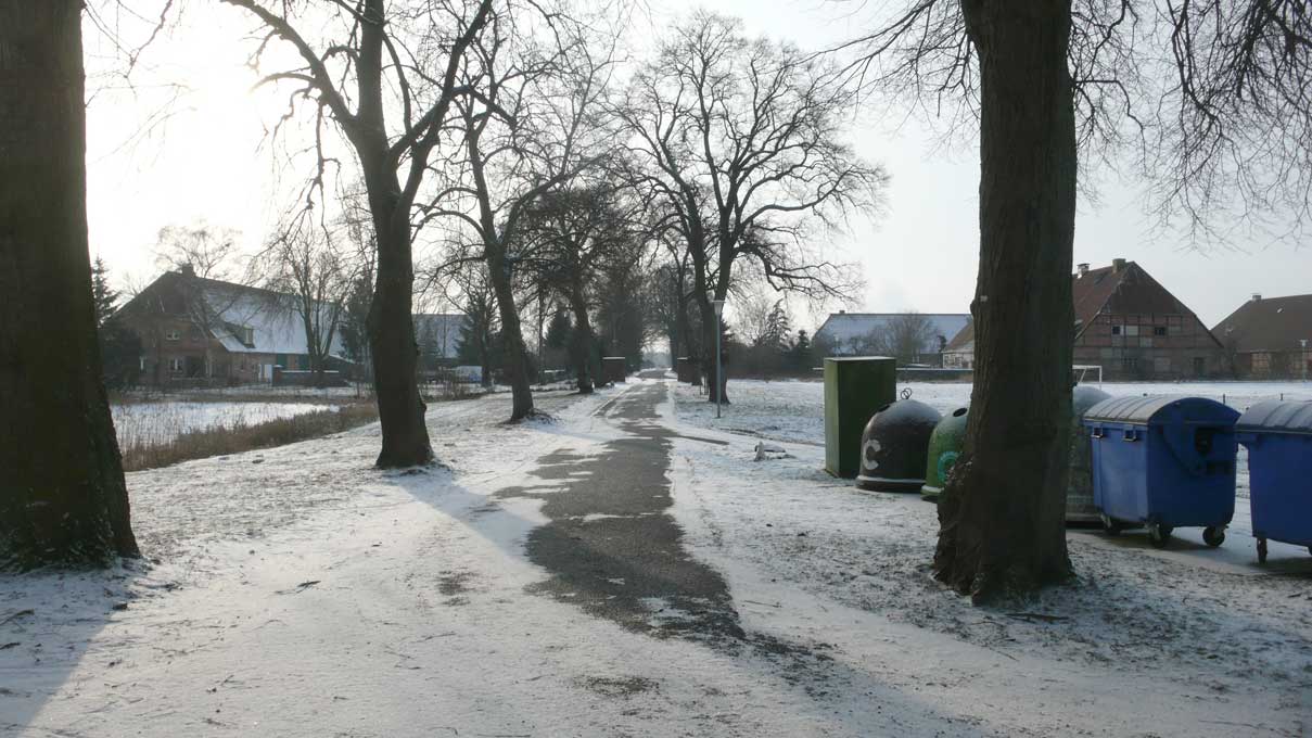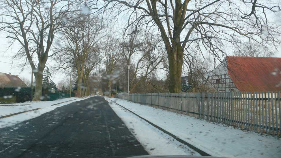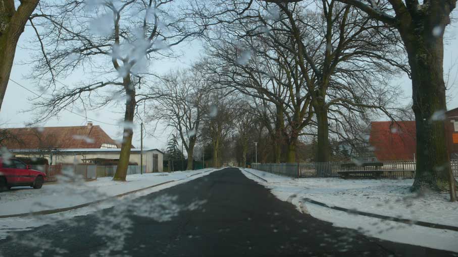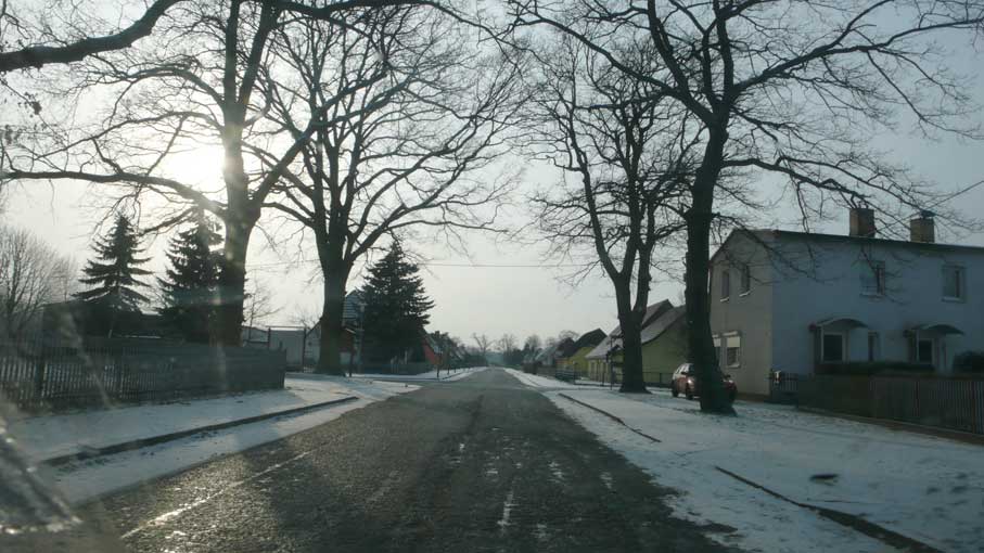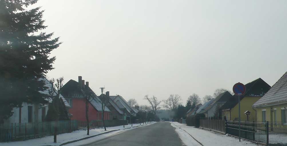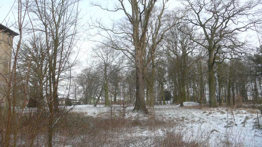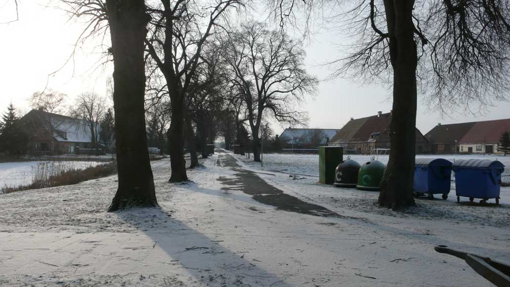 hinter den Häusern, und der querlaufenden Landstrasse, wo es zum Wald weitergeht, das Tor der beiden erhaltenen Linden als Anfang der Allee zum Schloss früher. Die ersetzenden Rotdorne als pflegeleichte Bonsei-Allee heute mit viel Geld aus Brüssel gepflanzt.
