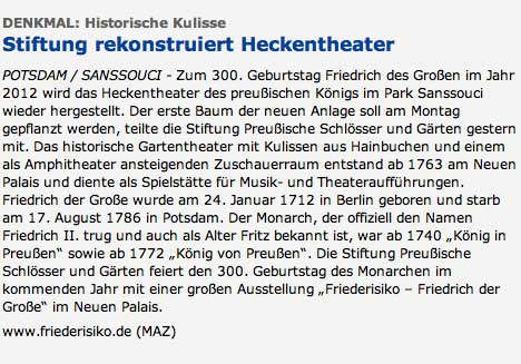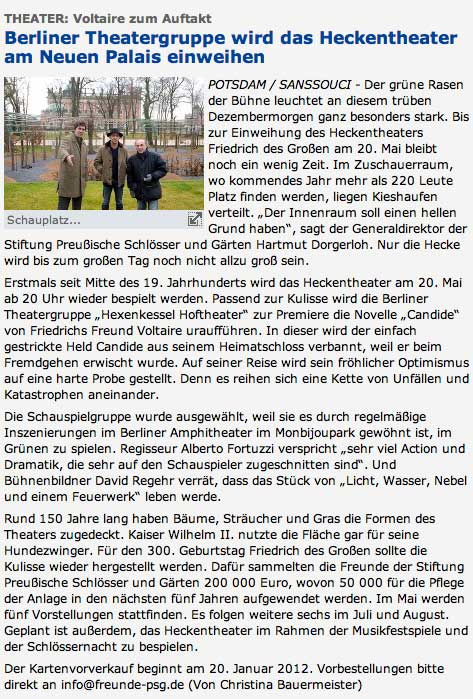 Anfang Mai soll in Potsdam das wiederhergestellte Theater im Park von Sanssouci mit einer Aufführung des Candide von Voltaire eröffnet werden.