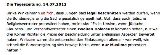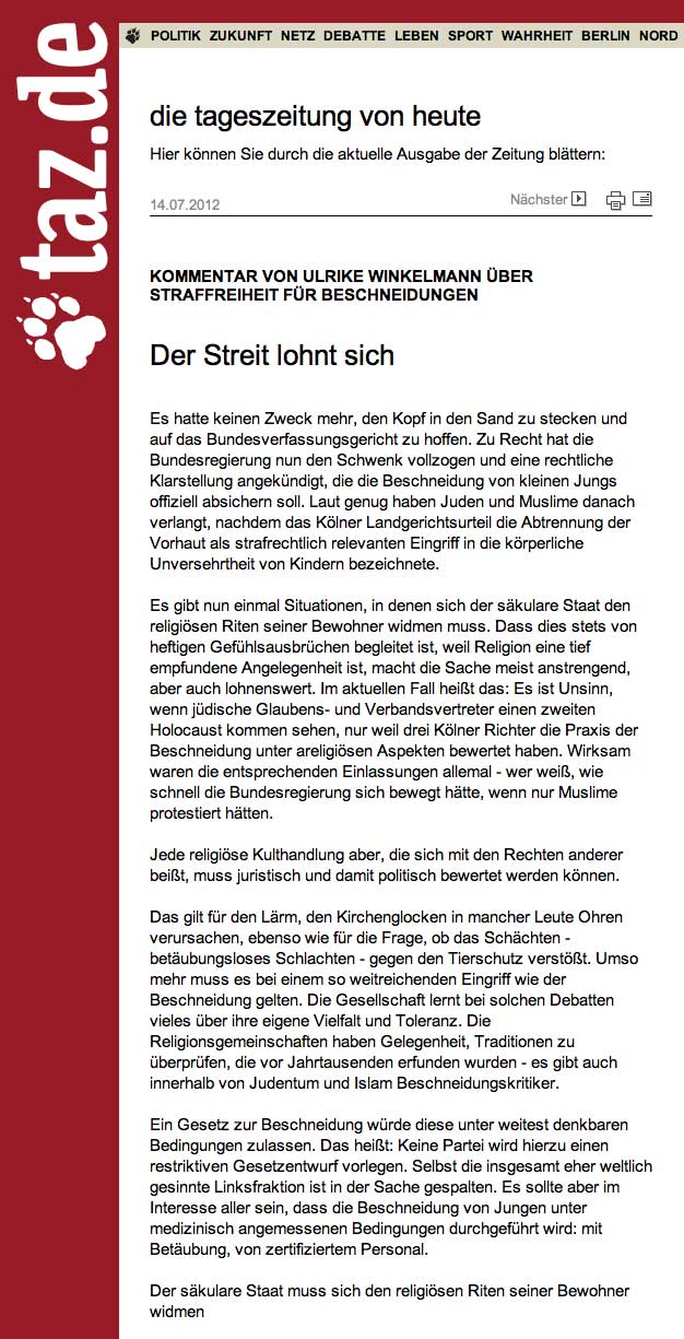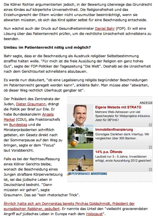 Beschneidungen müssten vollkommen legal weitergehen dürfen, schreibt der Vorsitzende Henry Brandt in der «Bild am Sonntag». Es reiche nicht, Beschneidung nur straffrei zu stellen.dh. sie müsse gesetzlich verankert werden.