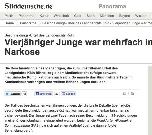 Die medizinischen Details seien dem Kšlner Landgericht bekannt gewesen, bislang aber nicht der …ffentlichkeit, hei§t es in der FAS. Ein Gutachter, der vom Landgericht Kšln beauftragt worden war, habe dem Arzt, der die Beschneidung vornahm, bescheinigt, dass der Eingriff "nach den Regeln der Šrztlichen Kunst durchgefŸhrt" worden sei. Die Nachblutungen, so der Gutachter, seien mšgliche Komplikationen nachÊBeschneidungen.Ê