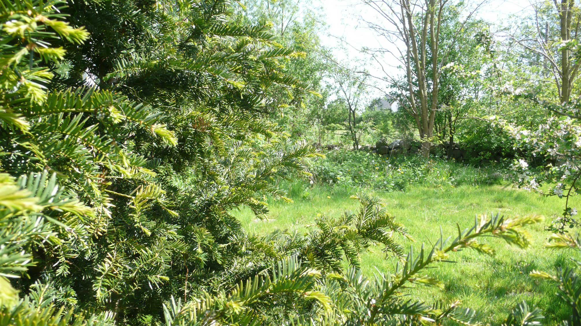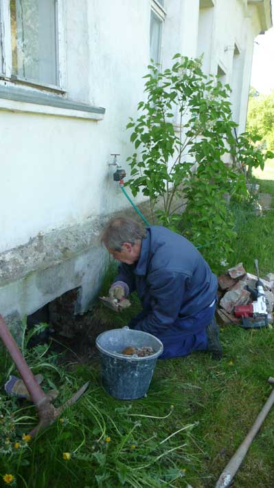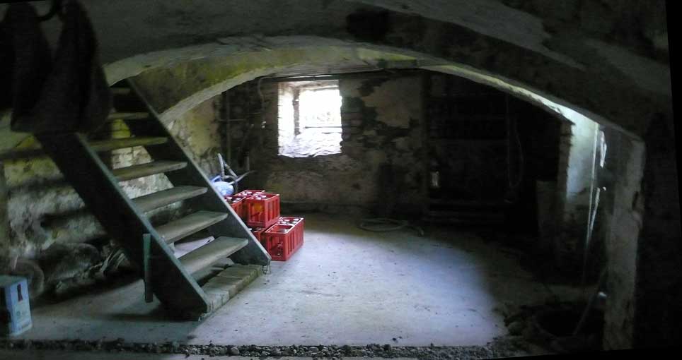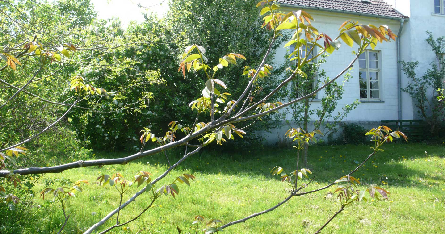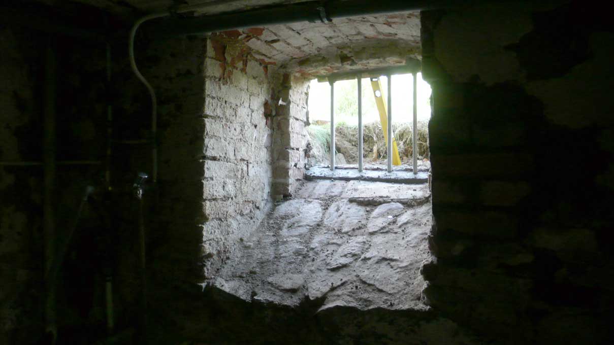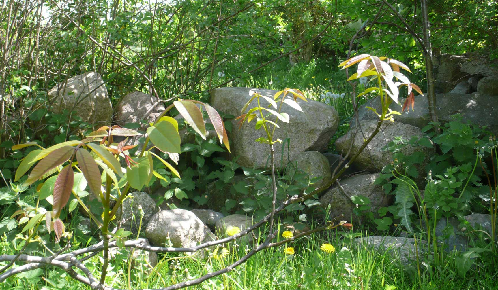 Zum Keller im Norden, wo früher die Kartoffeln und Wrucken und dergleichen für den Winter herabgescüttet wurden. Dann Einstieg für die Kinder, als das Haus zugemauert war. Jetzt mit Stäben und offen für die Luft zum zirkulieren.