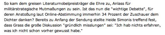 Misslungen ist es solche Leute, die als Politiker entscheiden, was gemacht werden soll und was nicht, nicht überzeugt wurden, was Kunst, hier in Gestalt eines Gedichts vermag, den Menschen und über die Granzen bewusst zu machen, was sie ohnehin jeden Tag hier und da lesen, hören und wissen können. Der Anspruch der uns nach Auschwitz abgesprochenen Poesie brachte es fertig, zu zeigen wo wir sind, stehe und was zu tun ist, auch ohne Atombombe, zu wissen, wer der Schuldige ist und vor wem wir uns vorsehen müssen. Nicht wählen, wer das nicht sieht und immer so weiter macht.