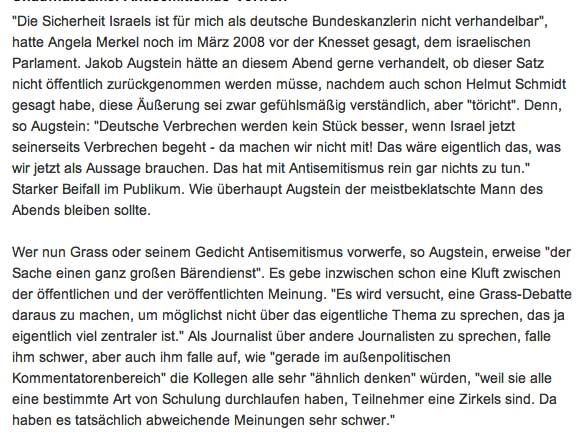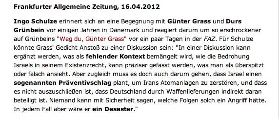 Theater/Goethemedallie 2011 Weimar. Sohn jüdischer Emigranten und schon immer misstrauisch gegen Israel als Enklave der USA und Brückekopf zum Öl in Nahost. Vergessen zu fragen was er zur Diskussion und dem Gedicht selbst von Grass dankt. Schade, Schüler Brechts, noch in dessen offenen Proben gesessen, als junger Freund der deutschen Litaratur aus Frankreich. Als sie damals 1990 tobten und stritten, sagte er nur, lasst ihn, er ist ein Bauer. Nun spricht er von Wurzeln. Als Jude weiss er, was das heisst. Da helfen selbst Atombomben nichts. Im Krieg hat er in einer Kiste unter der Treppe überlebt. Seine Kindheitswurzeln, jetzt willer Grabbe machen Hanibal und findet kein Theater, er, der 30 Jahre ein Theater leitete in Paris.