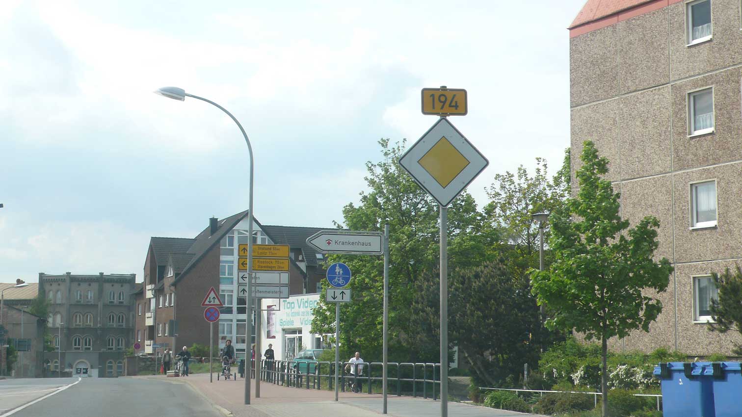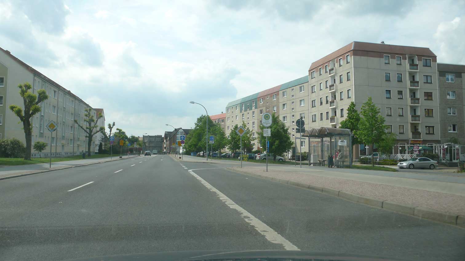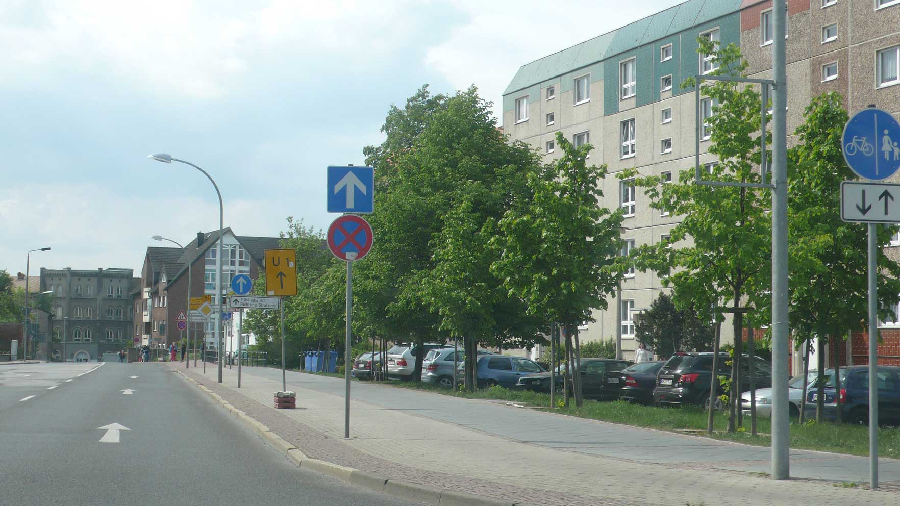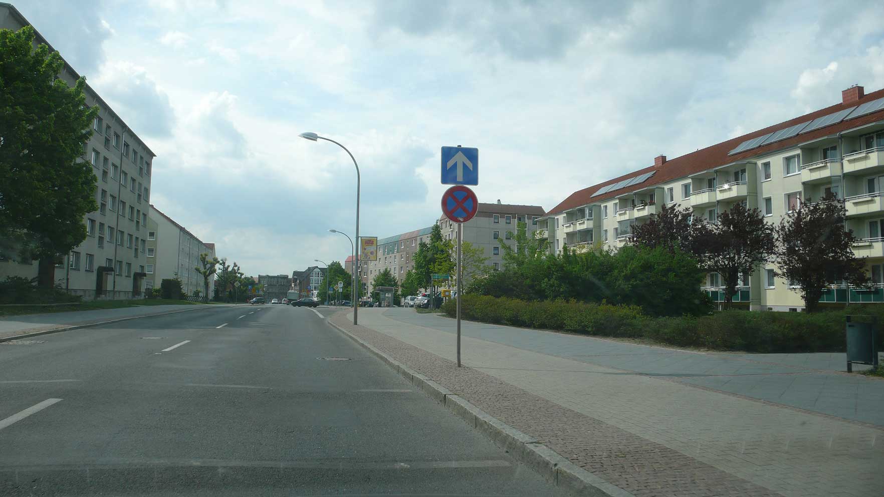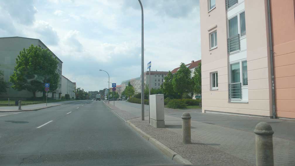 10 Schilder allein auf der rechten Seite, Peitschlampen und die graue Kaserne, die noch zu retten wäre, am Ende der Strasse