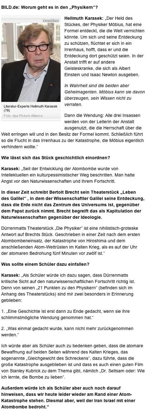 vorausgegangen war eine Abituraufgabe an die Schüler einer Klasse, deren Lehrer dieses Stück von Dürrenmatt und seine aktuelle Interpretation lieber nicht als Stoff angeboten, nicht hatte, vielleicht ahnte er was da herauskommen sollte, wie vorgeschrieben. Und er kennt ja seine Leute. Nun wurde der Chefinstrukteur der Median von BILD gebeten den Schülern mal zu sagen, wie man das liest und wie das aktuell zu interpretieren ist.