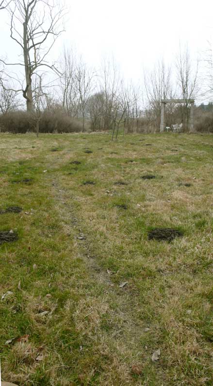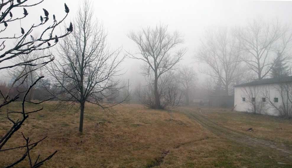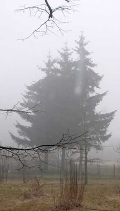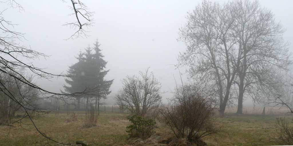 Den morgendlichen Blick Richtung Kirche über den früheren Hof bedeckt der Nebel gnädig vor dem, was dahinter heute unter dem ehem.Turm lauert.