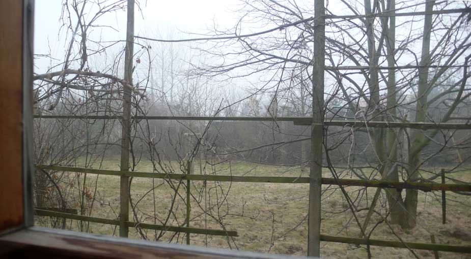 Aus dem Küchenfenster die armen DDR-Koniferen mit hochrasiertem Röckchen kastriert. Daneben die Eschen, noch in Gestalt der Bäume bei uns, haben überlebt