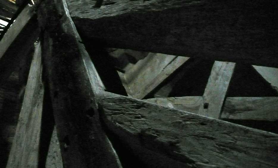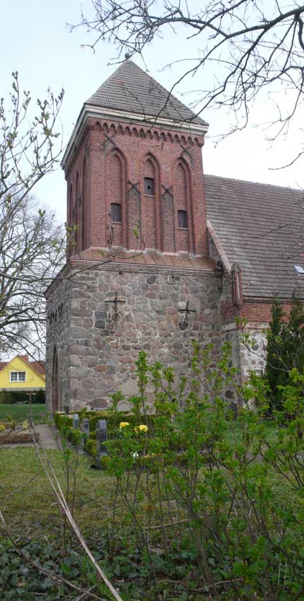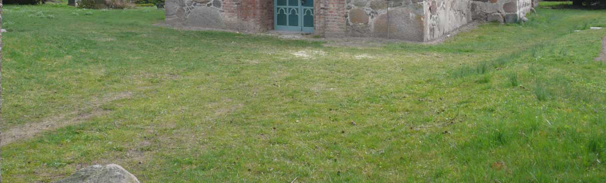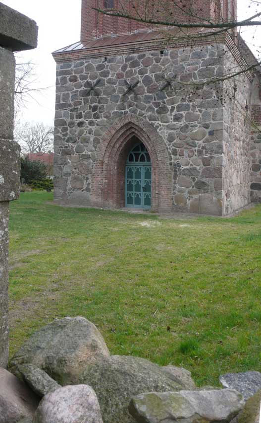 Feldsteine neu verputzt, die Verbindung zum Backsteinsockel mit Kupfer verkleidet.