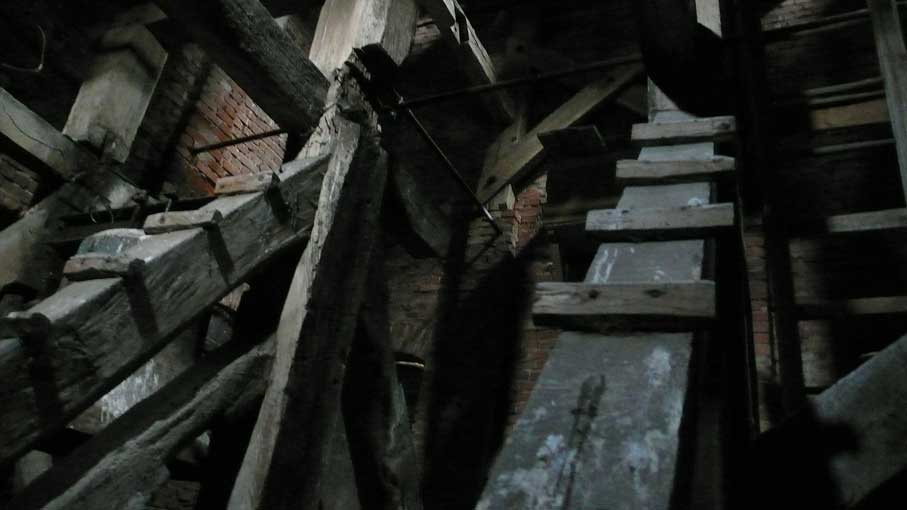 Der Turm - Sockel nach der Restaurierung. Der jetzige Helm , das Provisorium seit 1980, würde entfernt