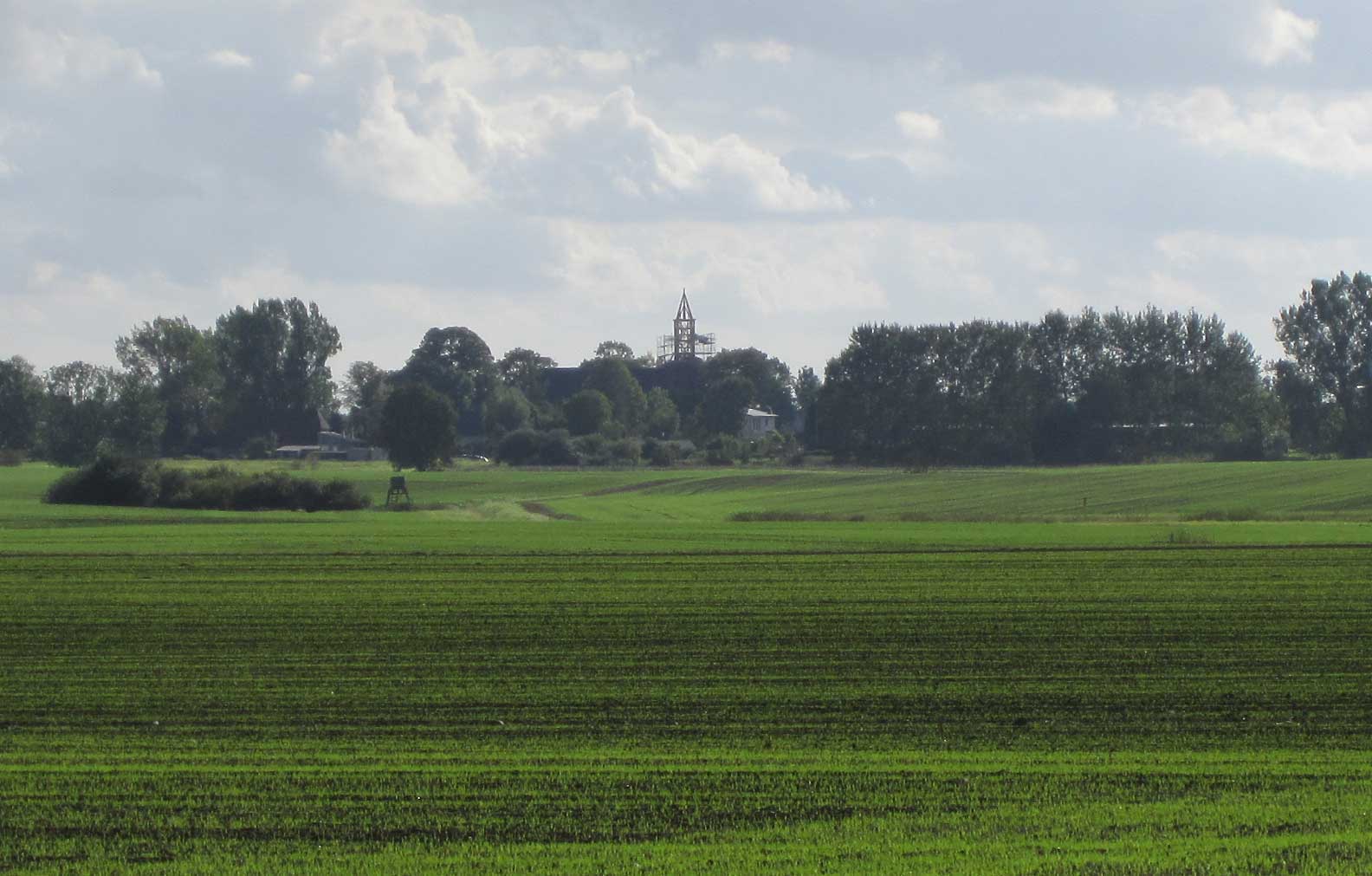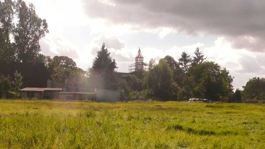 Der Turm ist nun da und beginnt sein Volumen zu erhalten, fern über die Felder