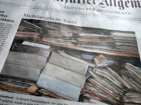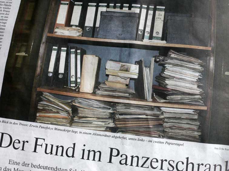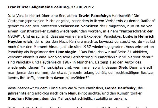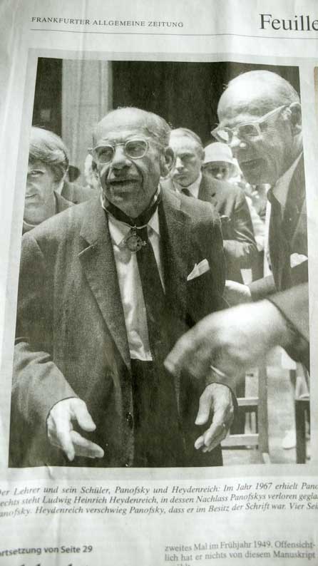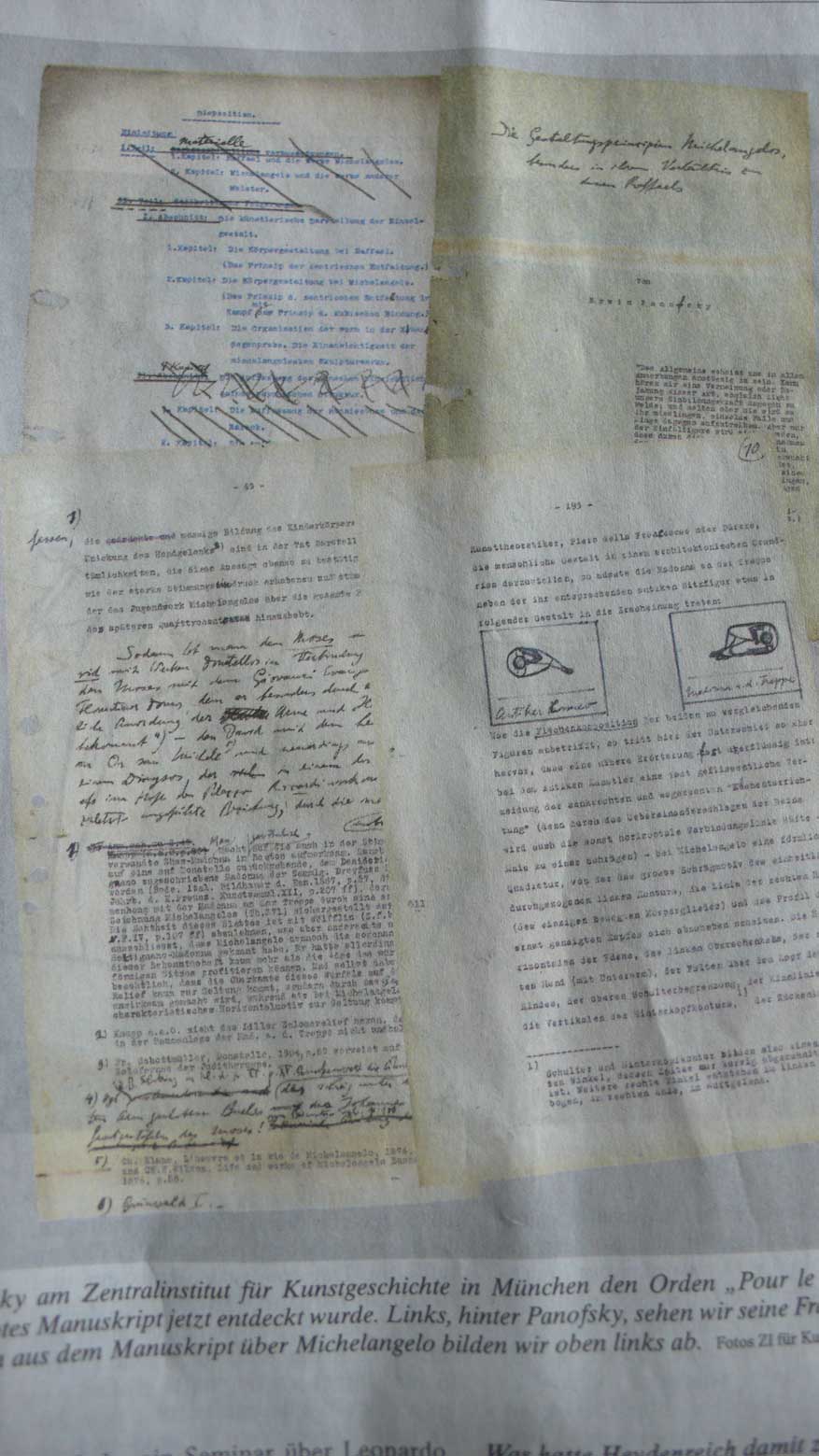 Als sie Meldung kam eine kunsthistorische Schrift von Panofsky, dem Emigranten , sei im Münchener Zentralinstitut, dem ehem. Verwaltungsgebäude NSDAP, in einem Panzerschrank der Partei gefunden worden, wo nach 1945 in den 50er und 60 er Jahren L.H Heydenreich unserer Lehrer das Institu, leitete, war mir klar, die Spur führrt zu ihm, und es hat nicht mit dem ehem. Gebäude uund dessen Funktion zu tun, aber sehr viel mit ihm, demrühmten Leonardoforscher, den die Schrift ging um Michelangelo und Raffael.