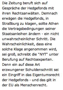 Athen - Ausgerechnet in der Schlussphase der Verhandlungen über einen Schuldenschnitt Griechenlands gibt es neues Störfeuer. Hedge-Fonds drohen einem Zeitungsbericht zufolge mit einer Klage vor dem Europäischen Gerichtshof für Menschenrechte, sollten sie per Gesetz zu einem Verzicht gezwungen werden. Die «New York Times» beruft sich auf Gespräche zwischen den Investoren und ihren Anwälten. Ausgangspunkt für eine Klage könnte eine mögliche Verletzung des Eigentumsrechts sein, das in Europa als Menschenrecht gilt.