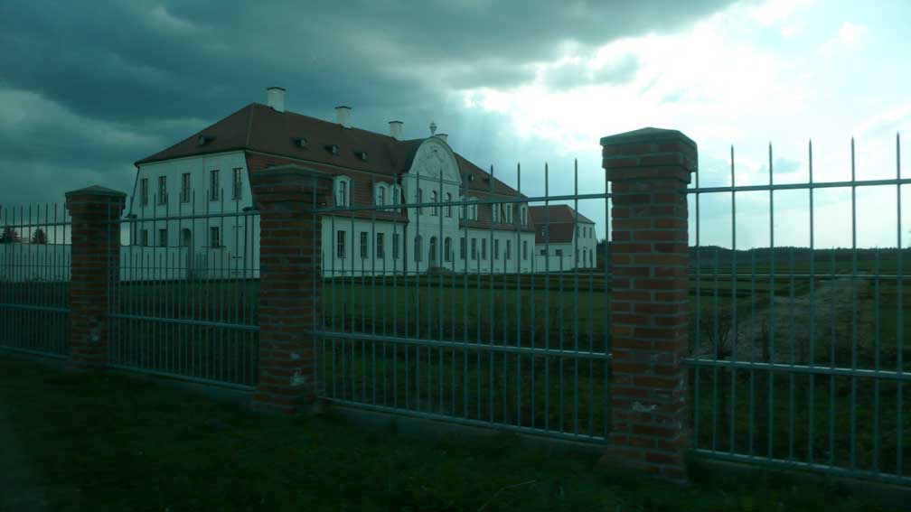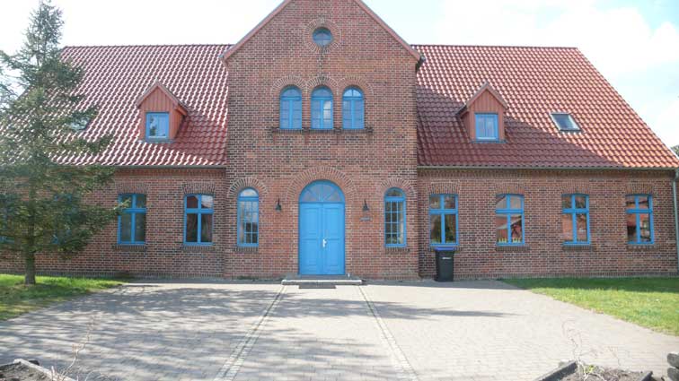 Wolde , 1.Ort der Exkursion, aus dem ehemaligen Gusthaus ein Gemeindezentrum machend mit Kita und eben geschlossener Totenfeier der Kaffe- und -Kuchen Trauer "in Gemeindehand" der einsamen Koniferen-Leere.